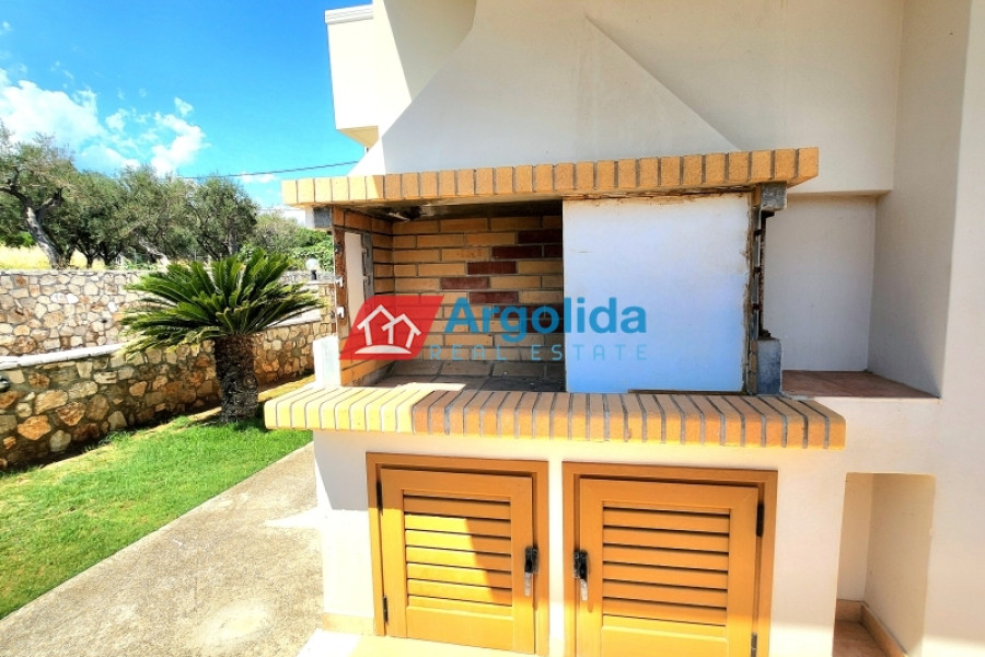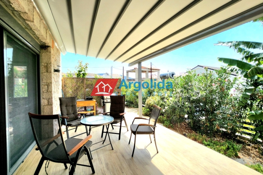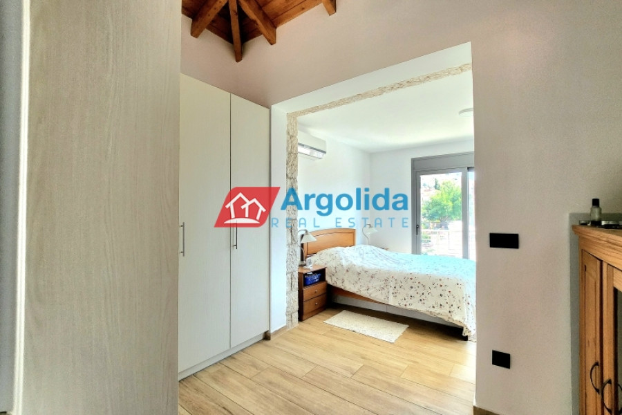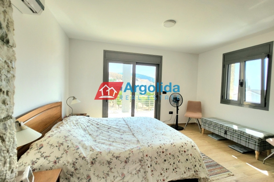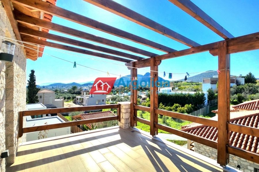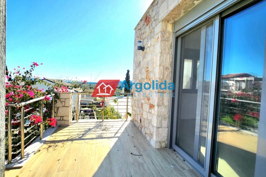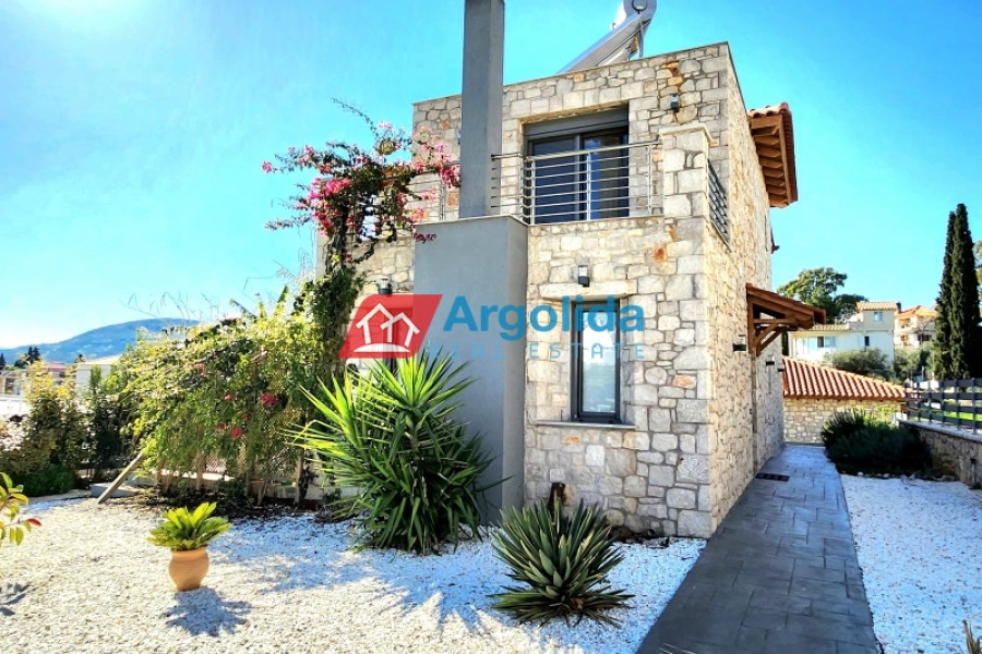 EXCLUSIVE LISTING OF OUR AGENCY – For sale: a detached, stone-built and bright single-family house of 142 sq.m., built on two levels within a fenced 437 sq.m. plot, with emphasis on construction quality, energy efficiency and aesthetics. The ground floor (86 sq.m.) offers a spacious living room with energy fireplace, large veranda with BBQ and new aluminum pergola, separate kitchen with built-in appliances, bathroom, laundry area and one bedroom, while the upper floor (56 sq.m.) includes two high-ceiling bedrooms with fitted wardrobes, bathroom and large verandas; additionally, there is a 17 sq.m. semi-basement storage room. The house is rated Energy Class A and equipped with Mitsubishi heat pump, underfloor heating, air conditioning in all rooms, thermal-break frames, double energy-efficient glazing, electric shutters, solar water heater, reinforced security door, satellite dish and alarm system. Outdoors, the landscaped garden features stone paving, stone walls with deck railing, electric entrance gate, BBQ, parking for two cars and provision for a swimming pool. The sale includes the built-in kitchen appliances (oven, hob and a single-door refrigerator) as well as a new water softening filter, while there is also a remaining building allowance of 42 sq.m. The location is excellent, just a short distance from the sea, close to Tolo, Drepano, Vivari and Iria, and only 6 km from Nafplio.