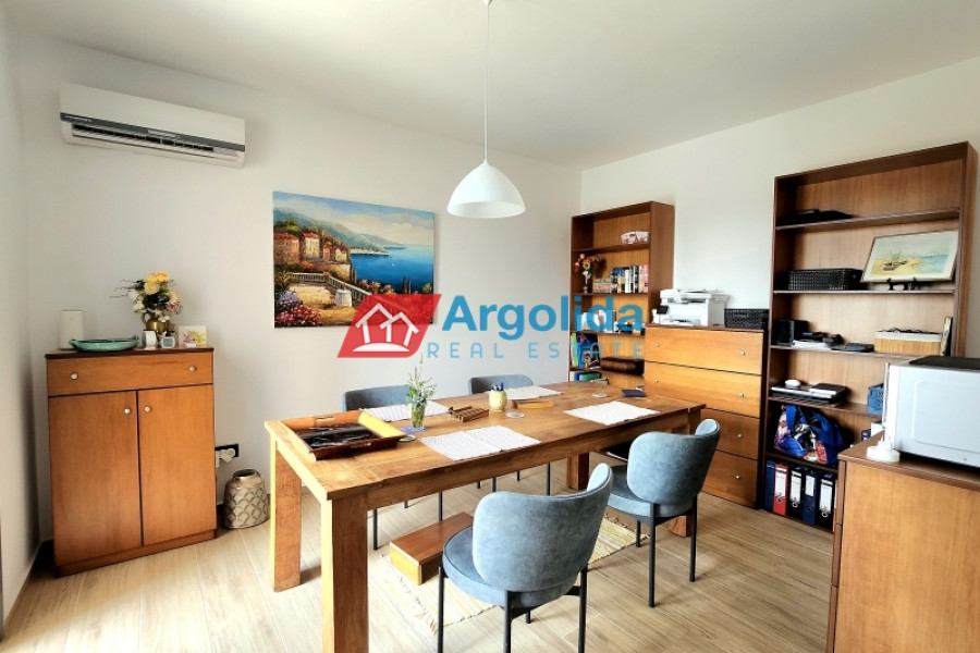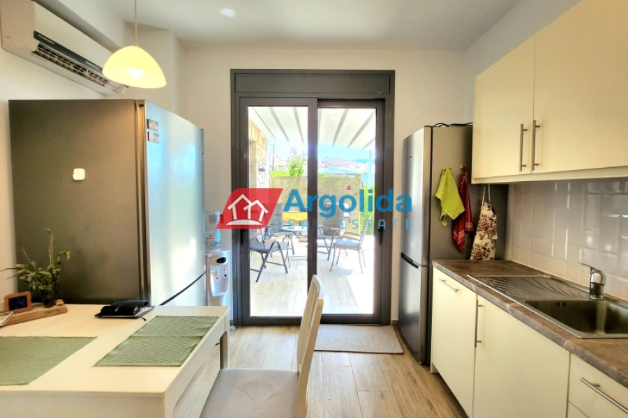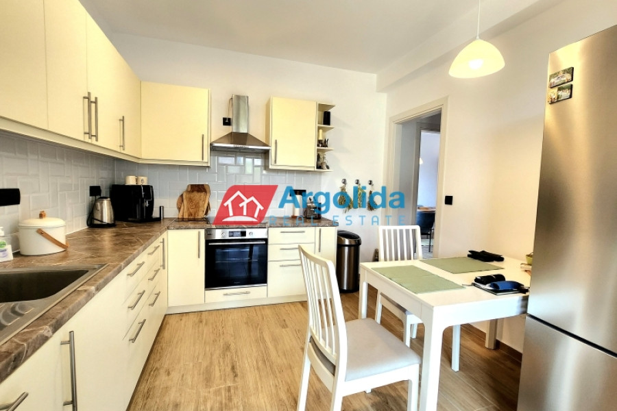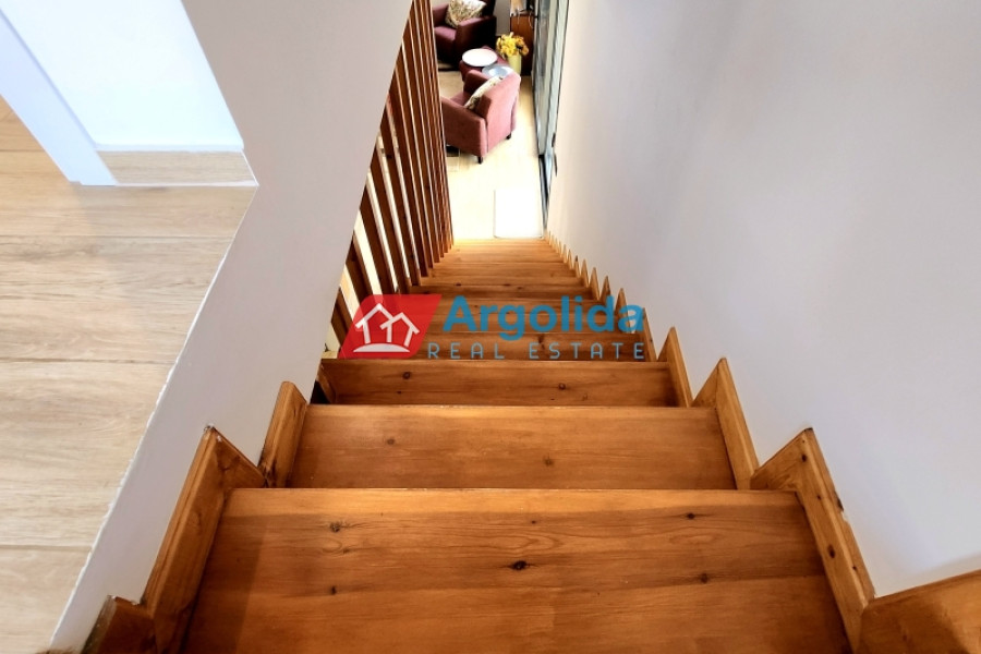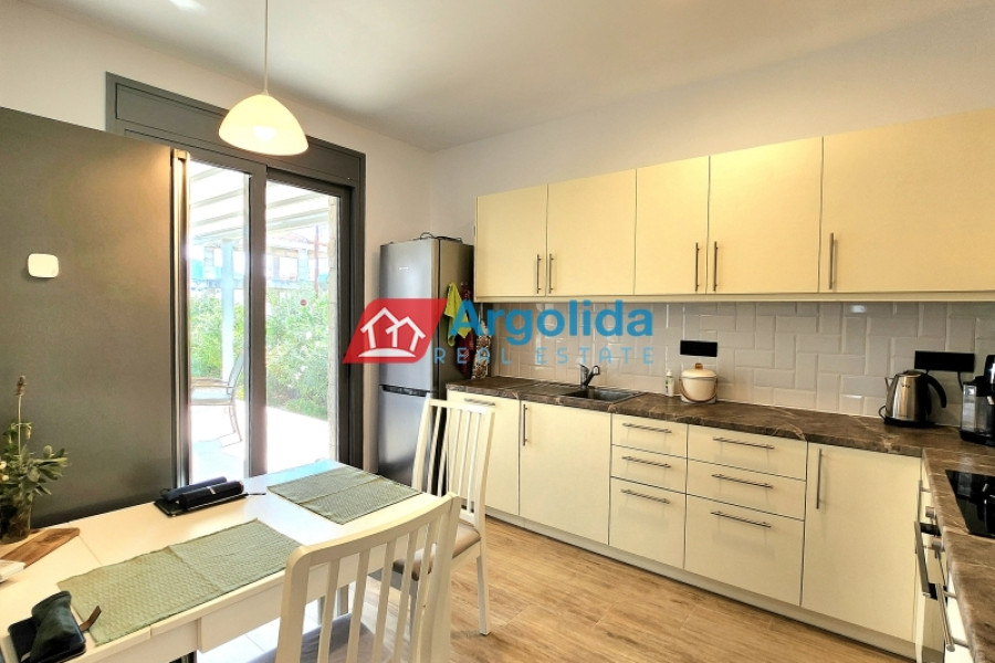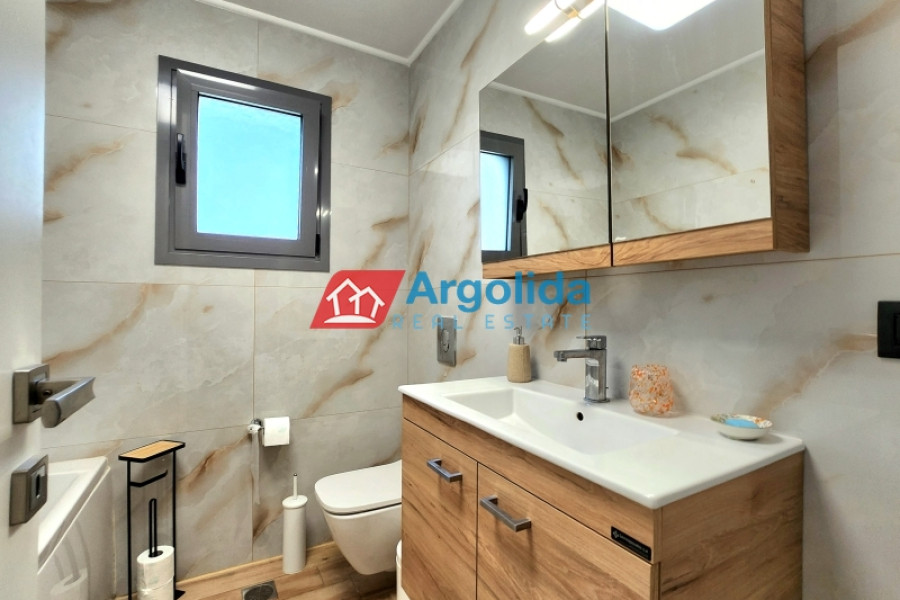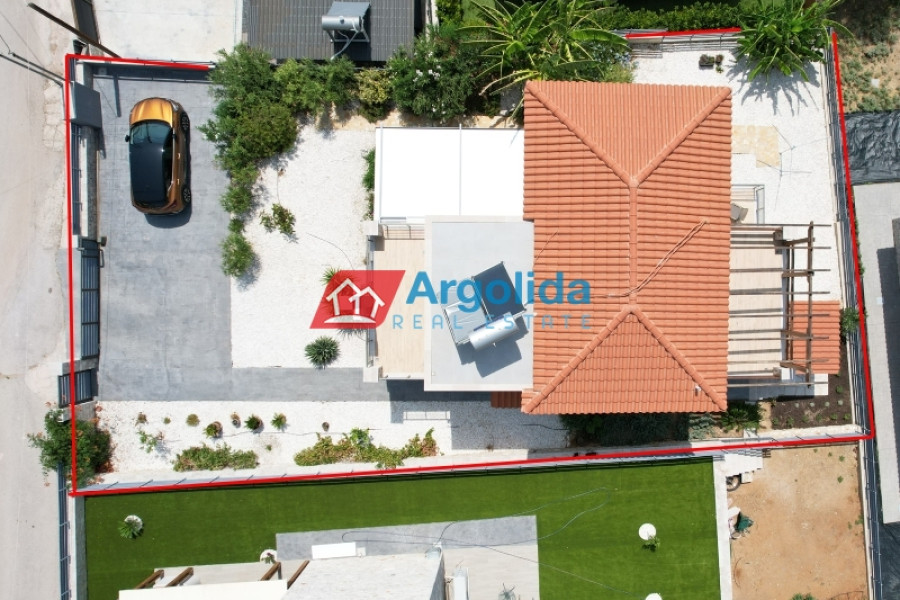 EXCLUSIVE LISTING OF OUR AGENCY – For sale: a detached, stone-built and bright single-family house of 142 sq.m., built on two levels within a fenced 437 sq.m. plot, with emphasis on construction quality, energy efficiency and aesthetics. The ground floor (86 sq.m.) offers a spacious living room with energy fireplace, large veranda with BBQ and new aluminum pergola, separate kitchen with built-in appliances, bathroom, laundry area and one bedroom, while the upper floor (56 sq.m.) includes two high-ceiling bedrooms with fitted wardrobes, bathroom and large verandas; additionally, there is a 17 sq.m. semi-basement storage room. The house is rated Energy Class A and equipped with Mitsubishi heat pump, underfloor heating, air conditioning in all rooms, thermal-break frames, double energy-efficient glazing, electric shutters, solar water heater, reinforced security door, satellite dish and alarm system. Outdoors, the landscaped garden features stone paving, stone walls with deck railing, electric entrance gate, BBQ, parking for two cars and provision for a swimming pool. The sale includes the built-in kitchen appliances (oven, hob and a single-door refrigerator) as well as a new water softening filter, while there is also a remaining building allowance of 42 sq.m. The location is excellent, just a short distance from the sea, close to Tolo, Drepano, Vivari and Iria, and only 6 km from Nafplio.