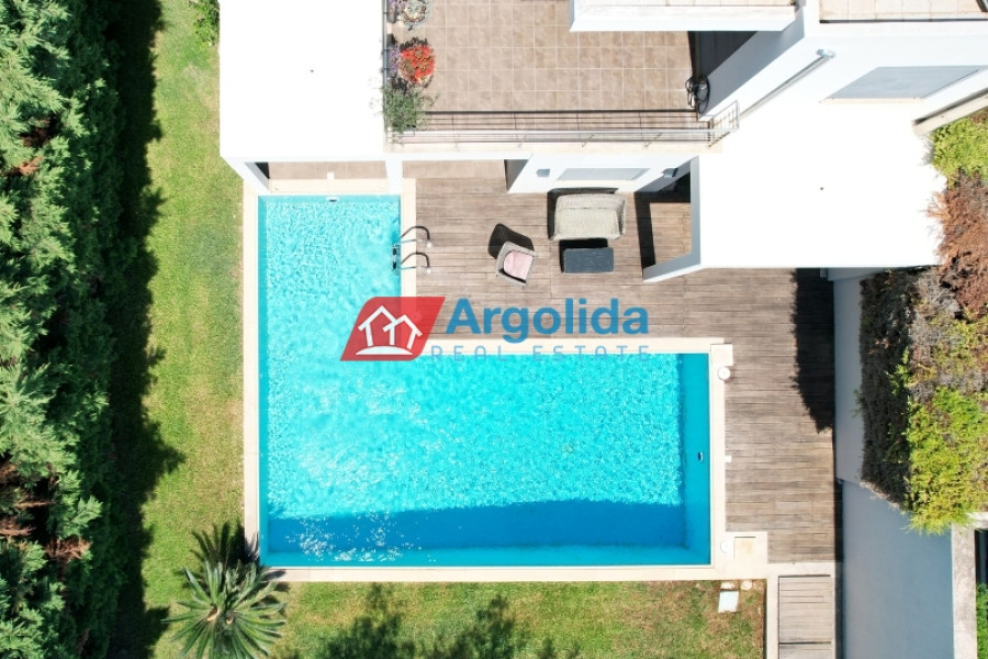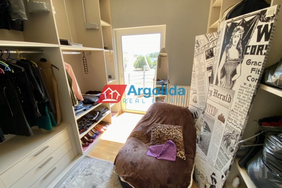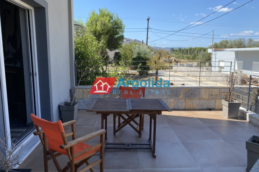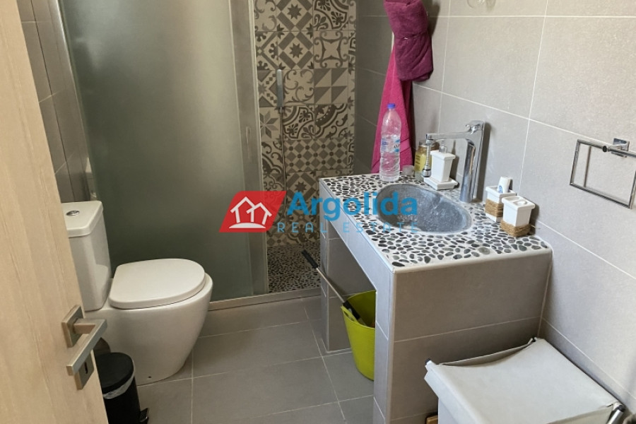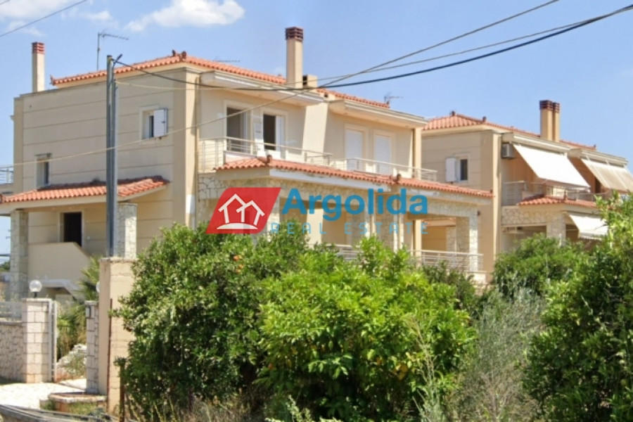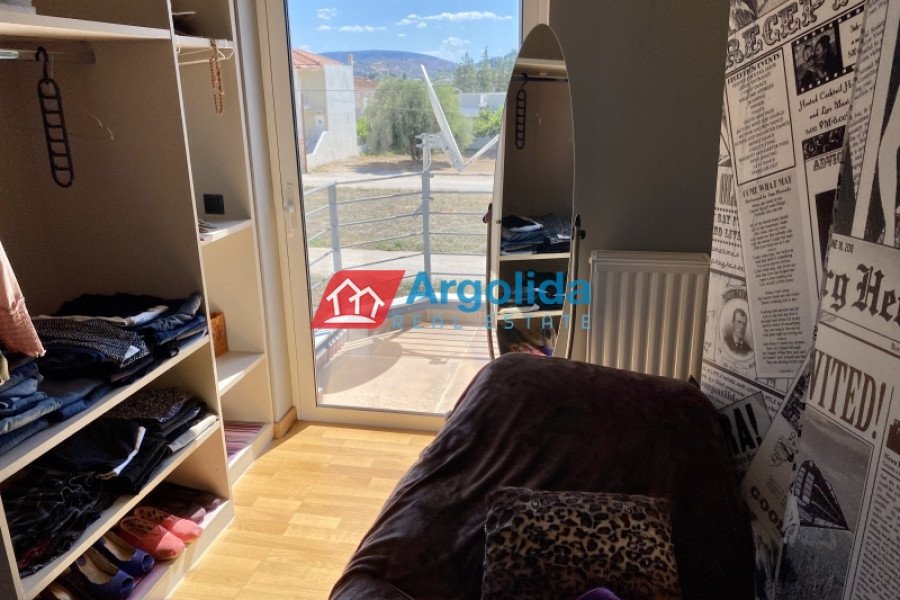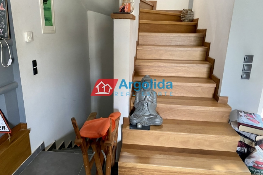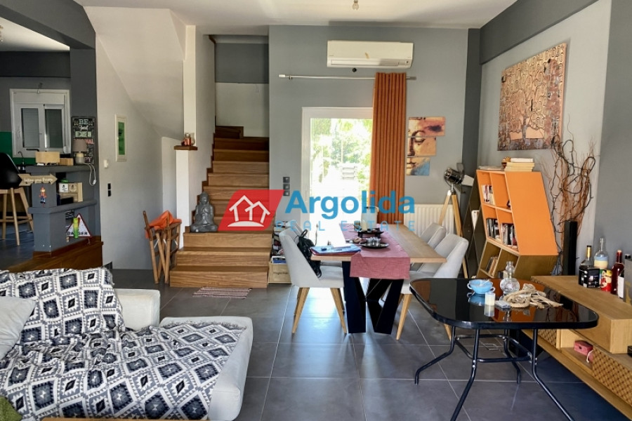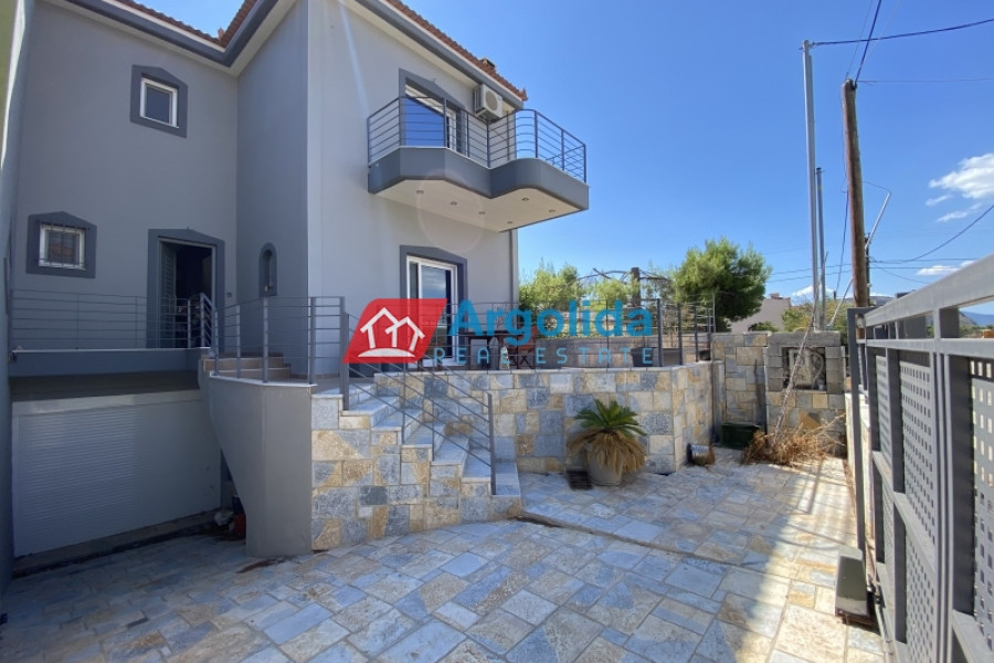 Under Legal and Technical Due Diligence - Located just a short distance from the town of Nafplio, this autonomous three-level maisonette with a total area of 185 sq.m. is offered for sale in excellent condition, boasting beautiful views of Palamidi Castle. The semi-basement (62 sq.m.) includes a closed garage, ample storage space, and a boiler room, offering full functionality and daily convenience. The elevated ground floor (62 sq.m.) features a spacious open-plan living area with a fireplace, a fully equipped split-level kitchen, a guest WC, and access to large front and rear terraces, ideal for relaxation or social gatherings. The first floor (62 sq.m.) hosts three bright bedrooms, each with its own private balcony, as well as a modern bathroom. The property is equipped with autonomous heating, a solar water heater, four air conditioning units, aluminum frames with double glazing and insect screens, and is characterized by its large openings that allow natural light to flood every space. Having been barely lived in, it is a perfect choice for a permanent residence or holiday home, combining peace and quiet with direct access to the heart of Nafplio.