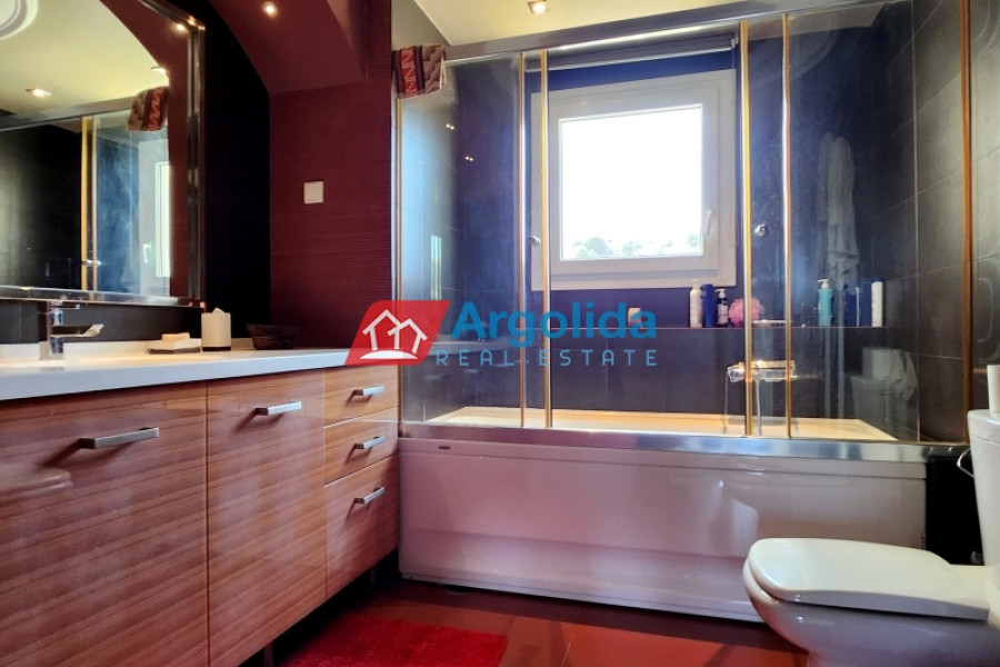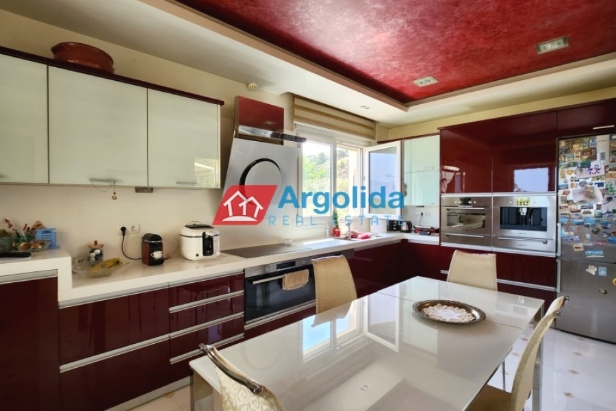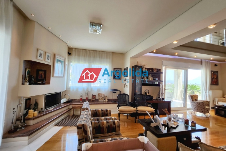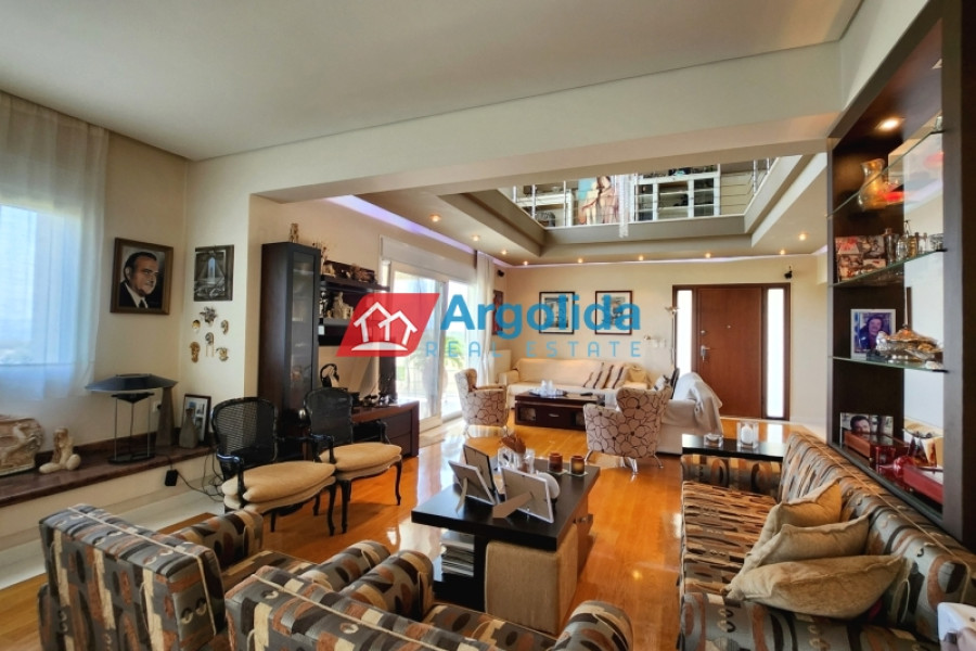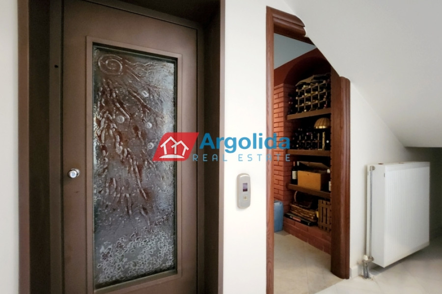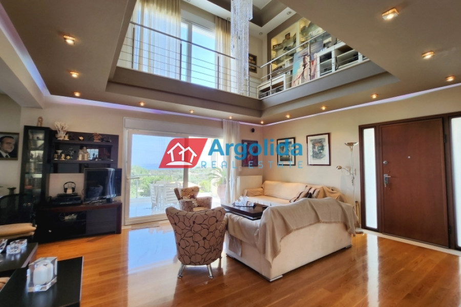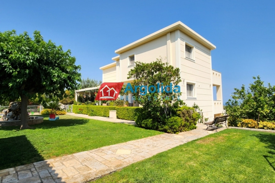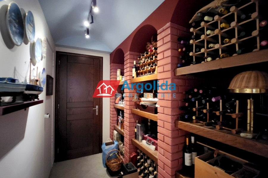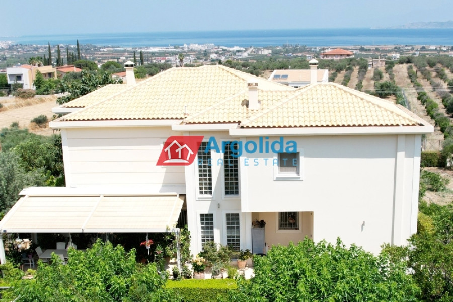 In a privileged location in Ancient Corinth, a luxurious three-level detached house of total area 422 sq.m. is for sale, situated on a privately owned plot of 7,000 sq.m. with stunning, unobstructed views of the Corinthian Gulf and the historic Castle of Ancient Corinth. The property consists of a main residence of 220 sq.m. on two levels and an independent, fully functional apartment of 70.55 sq.m. in the semi-basement with a separate entrance. The two-level main residence is spread over the ground floor and first floor and includes on the ground floor a large living room with fireplace, lounge, dining room, fully equipped kitchen in a separate space, storage room, and WC. On the first floor, there is a master bedroom with en-suite bathroom and walk-in closet, two additional spacious bedrooms, and an extra bathroom with jacuzzi. The semi-basement features a second living room with kitchen and energy-efficient fireplace, a bedroom, bathroom, as well as a cellar and storage rooms accessible both internally and externally.