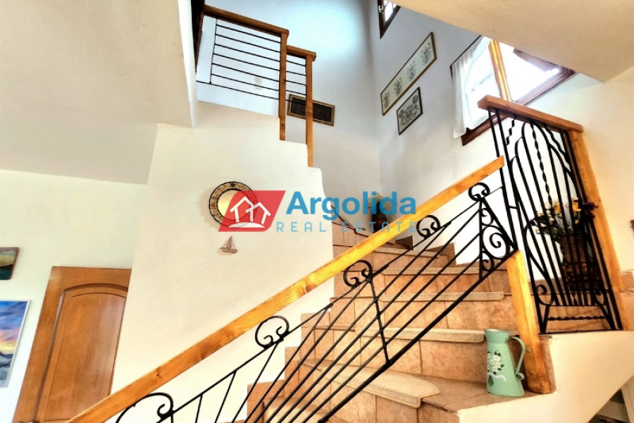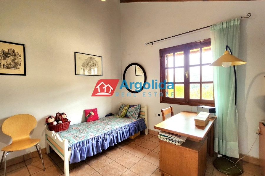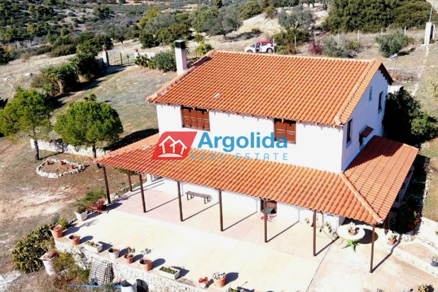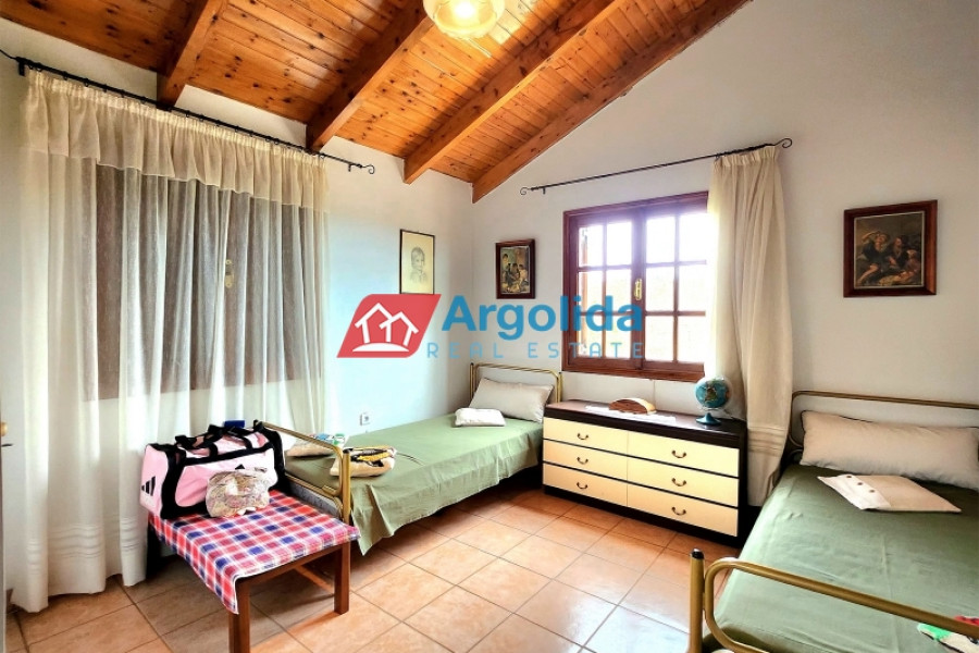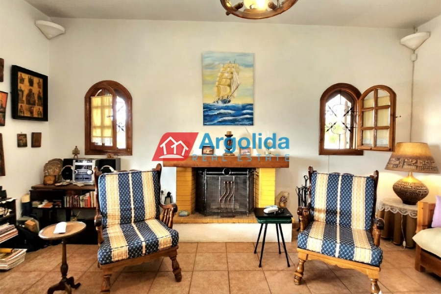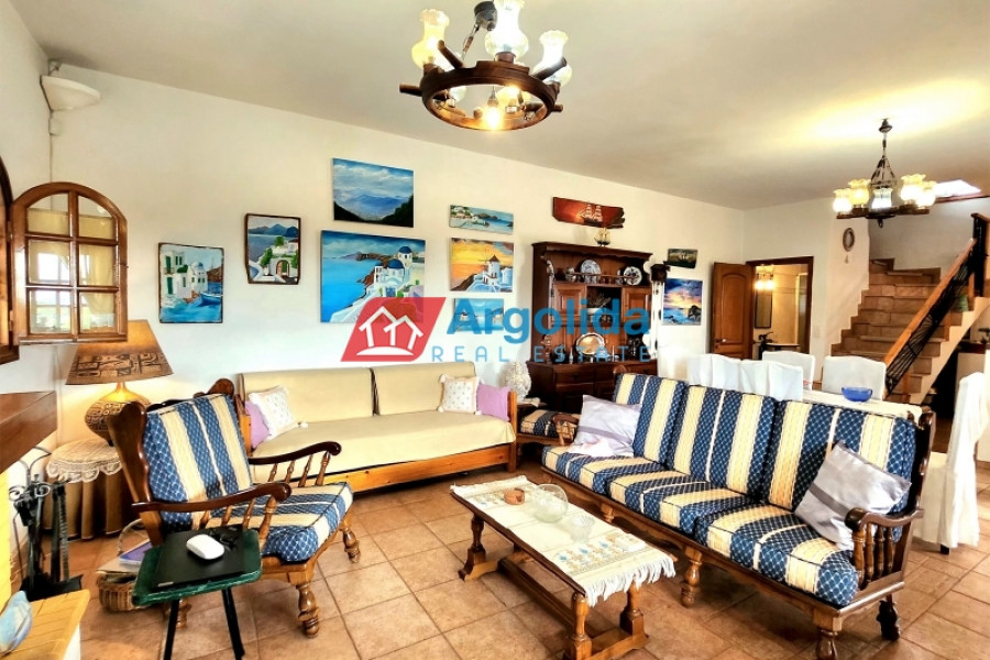 In a peaceful and verdant setting, perched on a gently sloping hill, this two-storey residence of 156 sq.m. offers uninterrupted views of the surrounding pine-covered mountains and the sea in the distance. Designed to provide year-round comfort, functionality, and tranquility, the home is ideal for those seeking a higher quality of life close to nature. The ground floor features an open-plan kitchen, living and dining area with a fireplace, as well as a bathroom. Upstairs, you'll find a second spacious living area, three bedrooms, and a full bathroom. The fenced plot is beautifully landscaped and includes a variety of fruit-bearing trees—12 olive trees, almond, pear, pomegranate, and fig trees—all equipped with an automatic irrigation system. A traditional BBQ area with a wood-fired oven and a large 140 sq.m. veranda, half of which is covered, offer ideal spaces for outdoor living and entertaining, with ample room for the future construction of a pool. Easily accessible from the main Epidaurus–Athens provincial road, the property is just 1 hour and 15 minutes from Athens International Airport and within close proximity to archaeological and tourist attractions. This home is an ideal choice for either permanent residence or a holiday retreat, offering serenity without isolation.