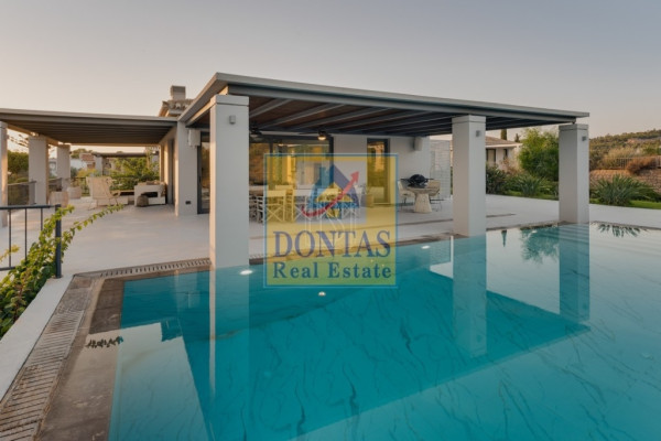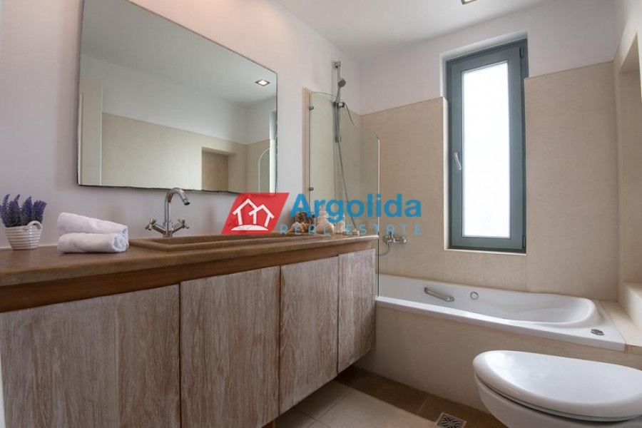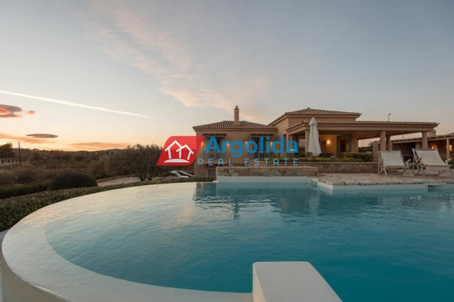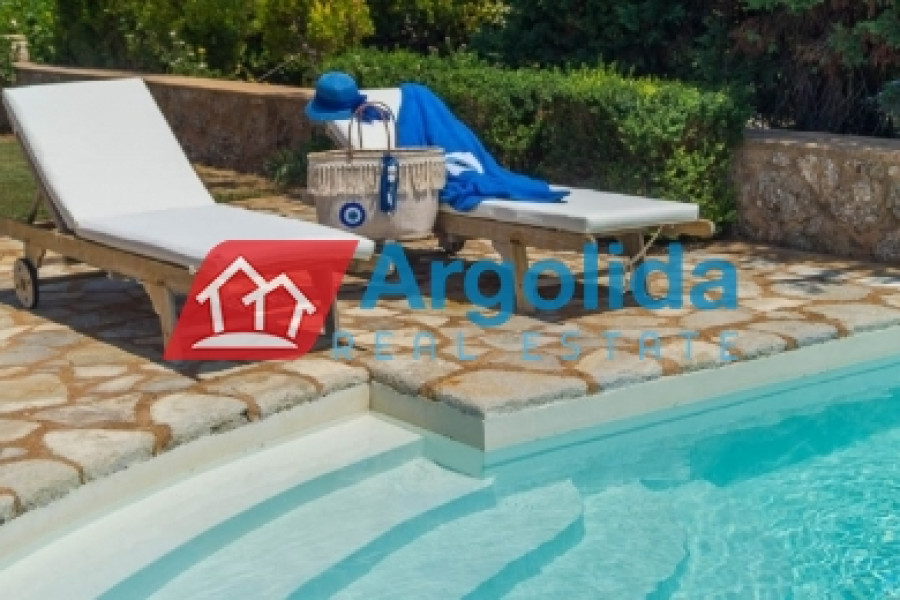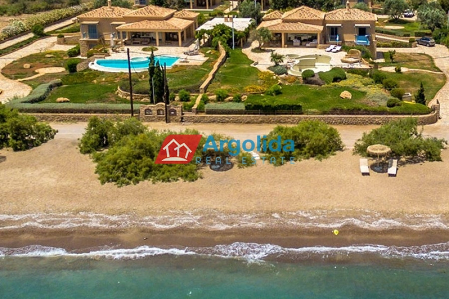 Villa Diamond, a luxurious property, is situated on a 2000 m² plot directly on the sandy pebble beach of Petrothalassa, offering magnificent sea views and vistas to the picturesque island of Hydra, divided over two levels: the upper level features a spacious living and dining room with fireplace overlooking the sea, a fully equipped kitchen, discreet guest WC, one master suite with full bathroom and large private veranda 50 m², perfect for relaxing while gazing at the tranquil turquoise waters, while the lower level offers two double bedrooms with en suite bathrooms and direct garden access, a playroom, one twin bedroom, guest bathroom, laundry room, and an autonomous guest suite with master bedroom, en suite bathroom and fully equipped kitchen, interiors are bright, airy and elegantly furnished for comfort and relaxation, the landscaped grounds include multiple entertainment areas around the 55 m² infinity pool, a shaded chill-out area with sofas, pergola-covered lounge with bar, large BBQ and outdoor dining area ideal for al fresco dining, perfect for hosting parties and events, just minutes’ drive from Porto Heli Town with shops, restaurants and amenities, close to cosmopolitan Spetses (5 minutes by sea taxi) and the world-renowned island of Hydra (30 minutes by sea taxi), making this luxurious villa a perfect combination of elegance, comfort and breathtaking seafront living for those seeking a beautiful and tasteful seafront home in Porto Heli.