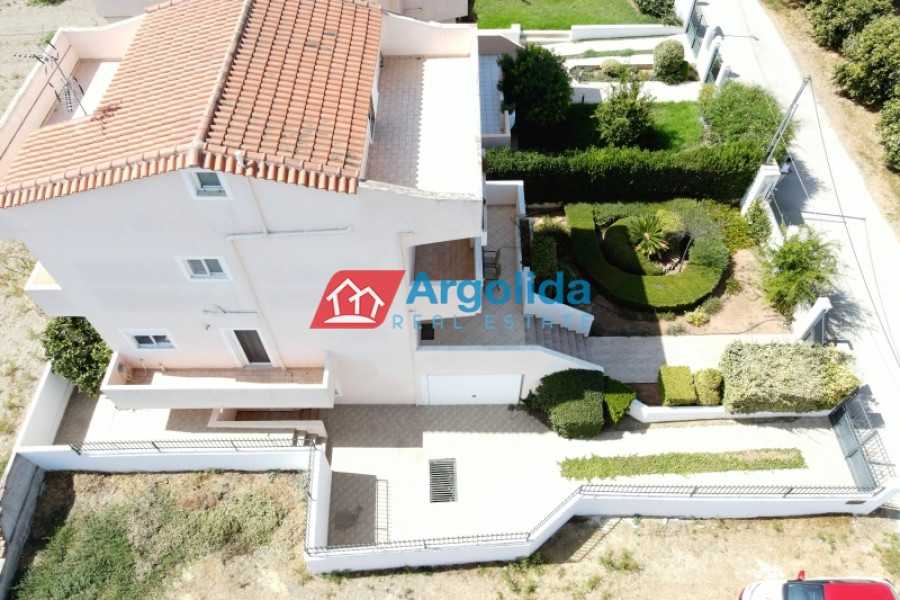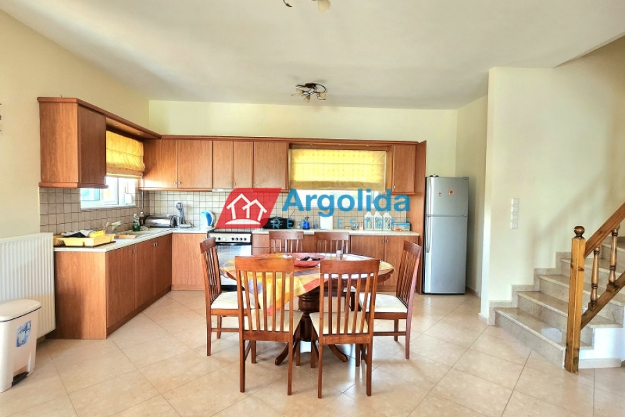 In Kato Assos Corinthia, a three-level detached maisonette (total area 220m²) with attic, and closed garage/storage room surrounded by a large yard is for sale. The house was built in 2008 and is in excellent condition. The elevated ground floor consists of the main entrance with a security door, a spacious and bright living-dining area with a fireplace along with the equipped kitchen, a guest bathroom and a large terrace. Upstairs the first floor has three spacious bedrooms with built-in wardrobes and one bathroom while the attic consists of a large single bedroom area with its own bathroom. The ground floor has an independent studio style space for guest use, (pre-plumbed and wired for a future kitchen) and a bathroom. The level also has the garage with storage facilities together with the boiler room. All levels are connected by an internal staircase. It also has built-in electrical appliances in the kitchen, oil heating with autonomy on each level, boiler, water tank, alarm in all areas, aluminum frames with double-glazed screens and a security door. The plot is fenced and faces a beautiful garden and a large yard. It is located in a quiet neighborhood with mainly newly built houses and is only 550 meters from the sea and 6 km from the city of Corinth.