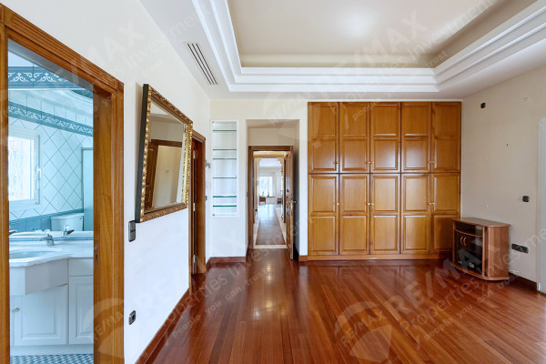 Continuing we will find a guest WC, a small Room – with natural light currently arranged as a wardrobe and laundry/ironing room, the spacious kitchen featuring marble countertops, handcrafted wooden cabinets and a central island with gas stove and oven. We end up in the very large Master Bedroom, with its own bathroom, comfortable walnut wardrobes, and a walk-in closet.
