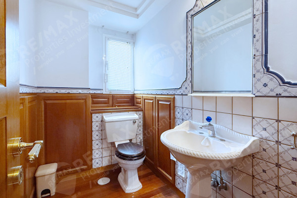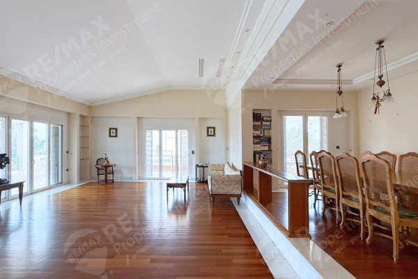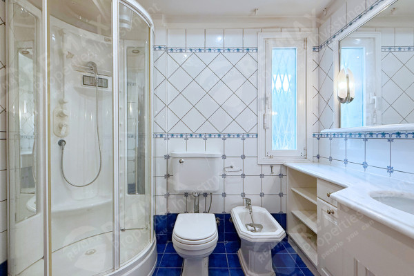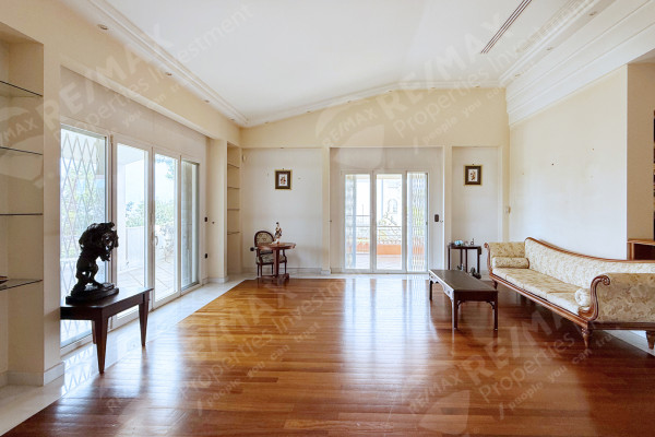 It comprises of a spacious living room bathed in natural light from many openings, with access to verandas and is developed on different levels. The layout is designed to accommodate a comfortable living room, a large dining room, and two smaller spaces ideal for use as a home office or a smaller sitting - reading room. The high-end oak flooring surrounded by white marble, the fixed fixture made of walnut wood, details such as a rare British cast iron gas fireplace, the crystal display cases and the ornate decorative ceiling with perimeter lighting await a tasteful furnishing to complete the luxurious atmosphere.