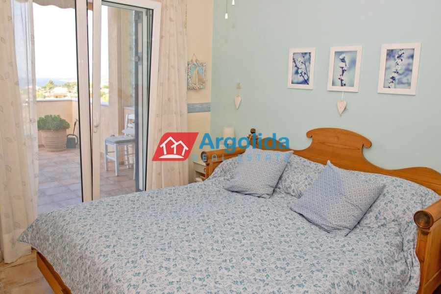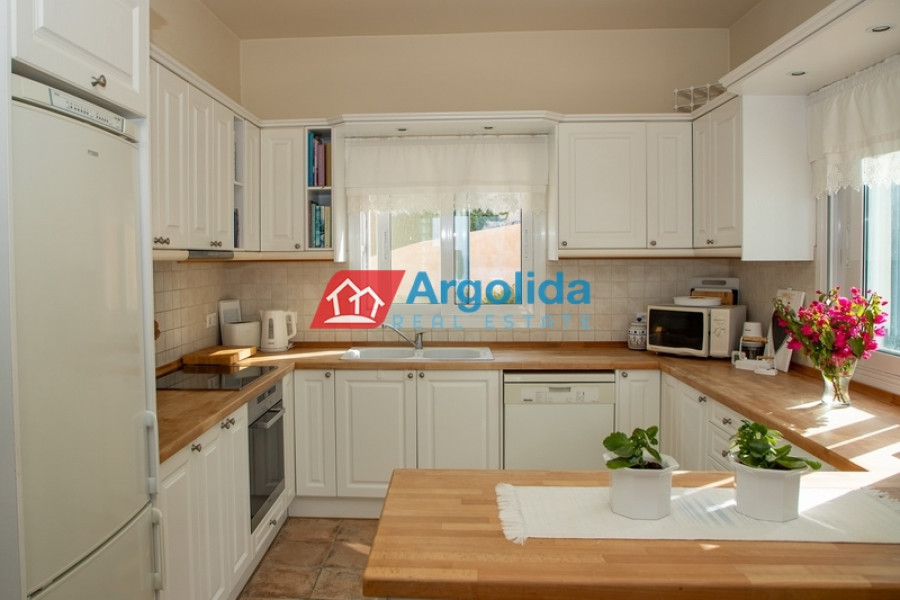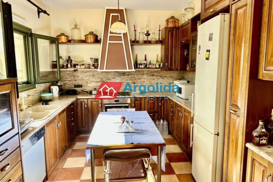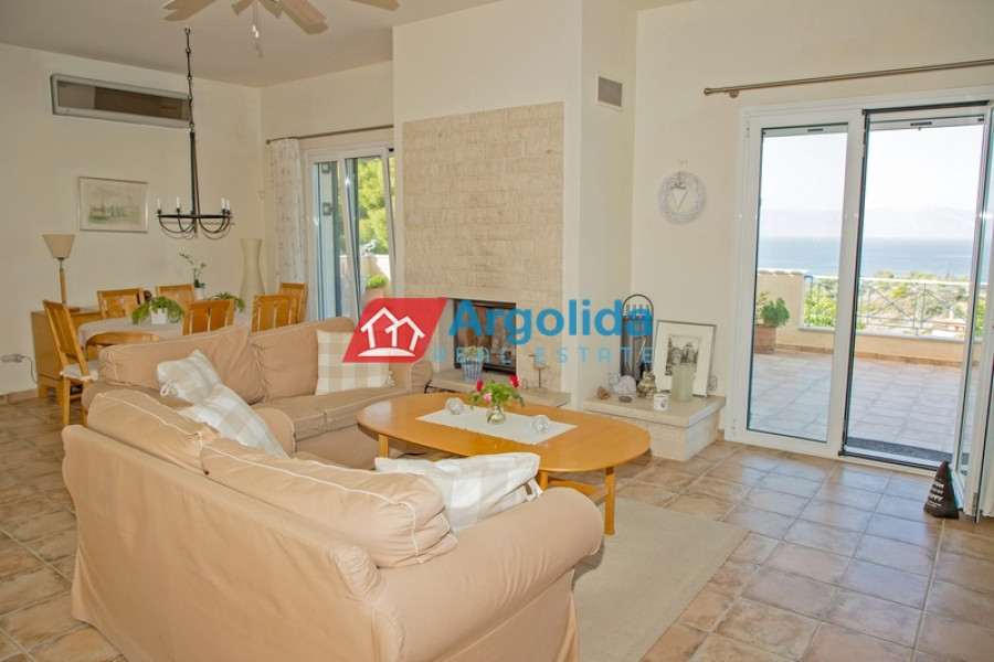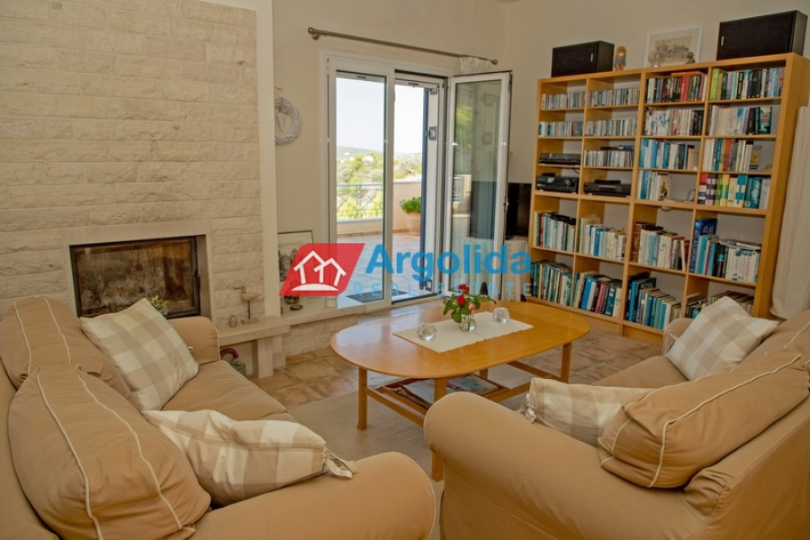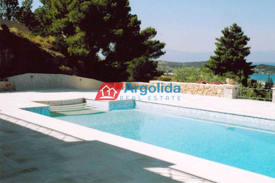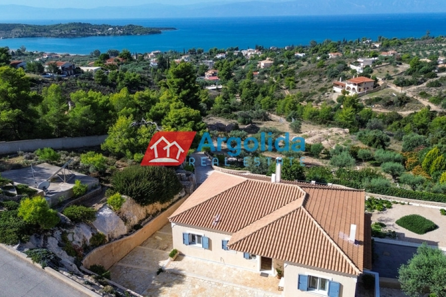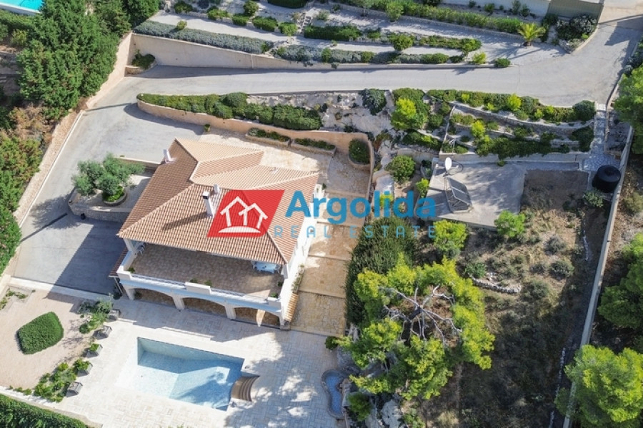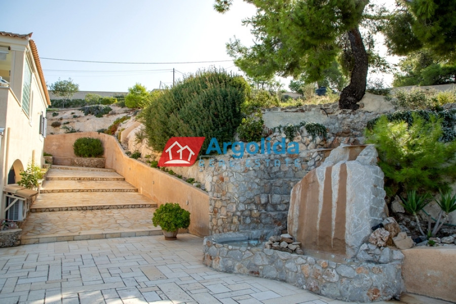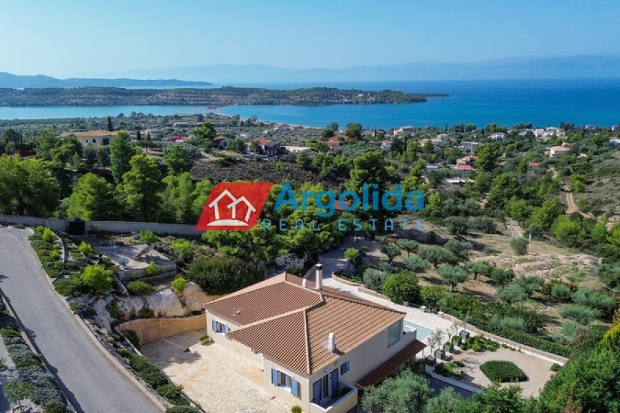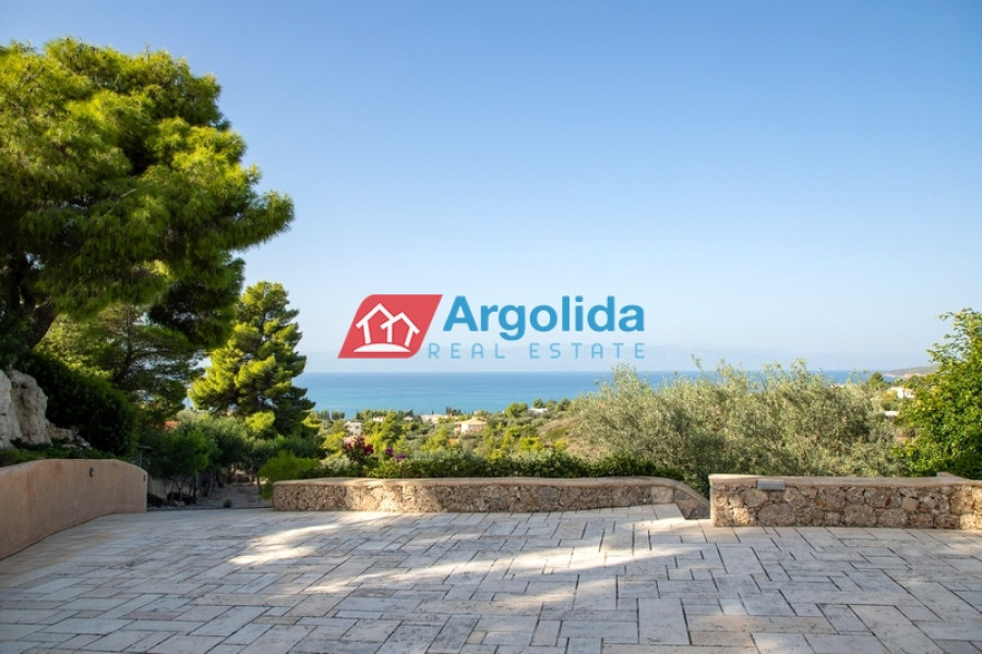 In one of the most beautiful seaside area of Portoheli, this luxurious 230 sq m villa offers panoramic sea views and a unique sense of tranquility and privacy. Built on an amphitheatrical plot of 4,070 sq m, it features a 50 sq m private swimming pool and is just a 2’ drive from the idyllic beach of Ververonda. The residence is spread over two levels, with each room enjoying unobstructed views of the blue. The ground floor hosts 3 bedrooms, 2 bathrooms, 1 WC and an elegant kitchen open plan to the living room, while on the first floor there is a single living room with fireplace, open kitchen, 1 WC and a large terrace ideal for relaxation. The villa's amenities include underfloor oil heating, A/C units throughout, a built-in vacuum system, as well as an internal garage, storage room, BBQ, built-in bar and outdoor dining area. The outdoor area is uniquely landscaped with local natural stone and a well-kept garden with ornamental plants and trees, creating an environment that is in perfect harmony with the natural landscape. With its own borehole and 36m³ water tank, the residence offers complete autonomy, while its prime location in a highly aesthetic neighborhood makes it an ideal choice for both permanent and holiday residence.