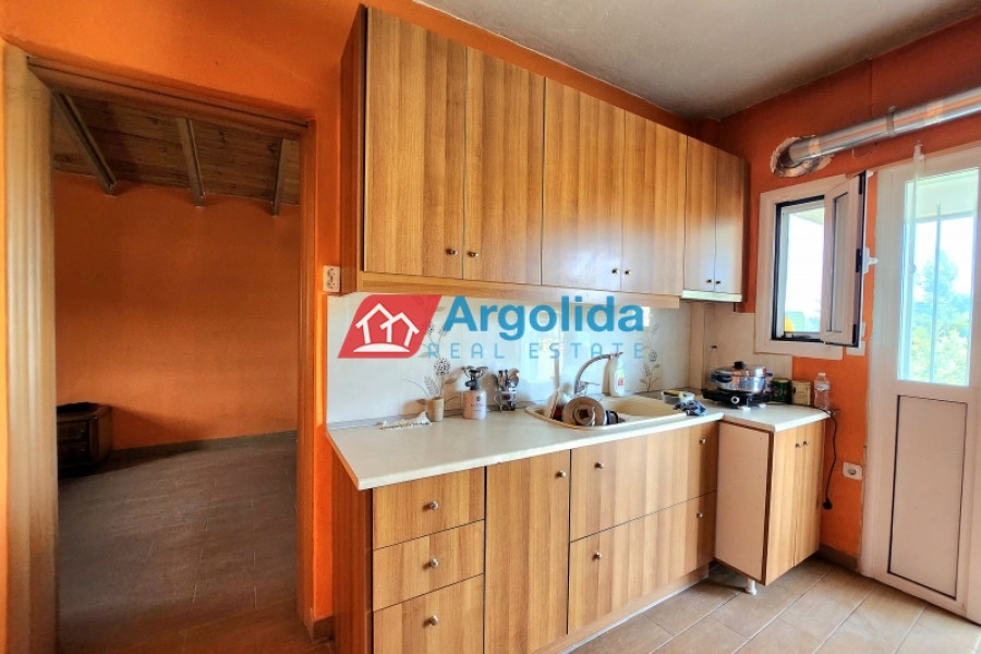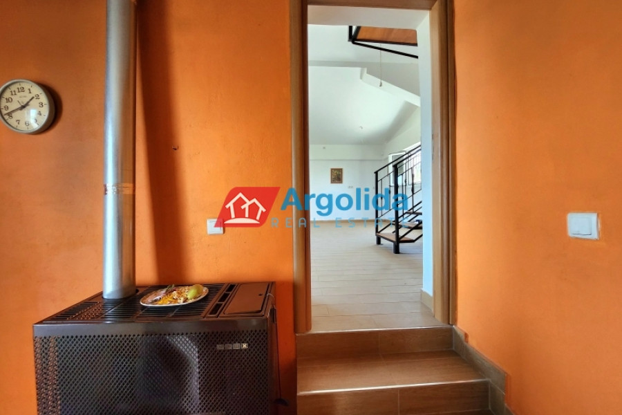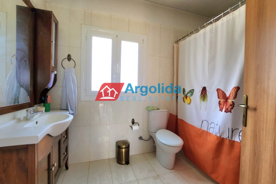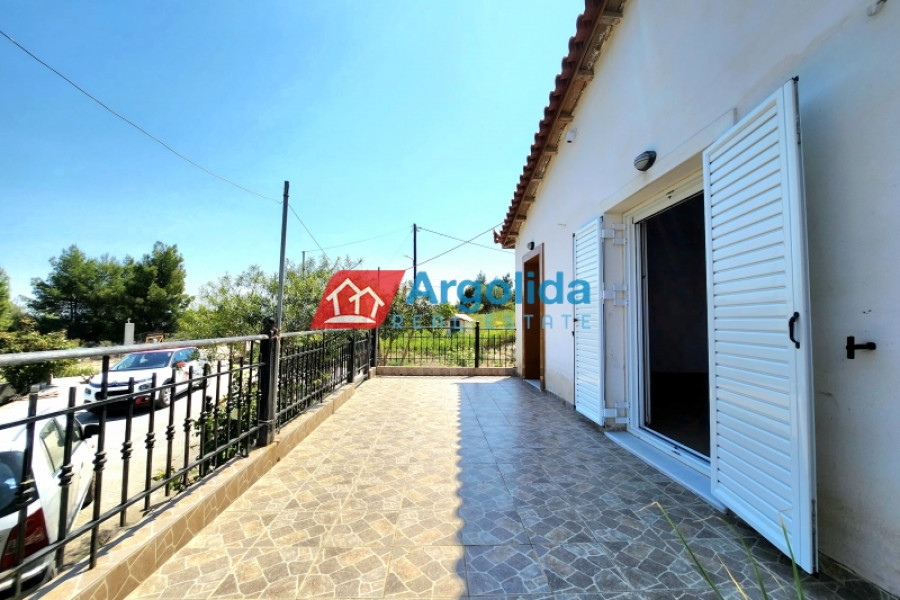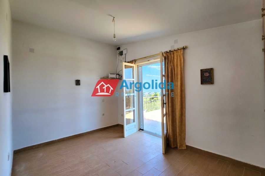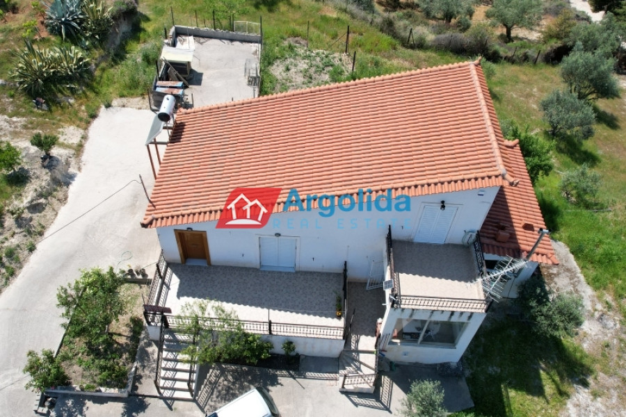 This detached house of 128 sq.m., fully renovated in 2015, is arranged over two levels connected by an internal staircase, set within a 4,000 sq.m. plot featuring paved areas, a landscaped garden and a large olive grove, enjoying a peaceful countryside location with panoramic views over the plain and the Corinthian Gulf. The elevated ground floor comprises a spacious living-dining area, separate kitchen, one comfortable bedroom, a large bathroom and a small storage room, while the upper level offers two bedrooms with fitted wardrobes and a WC; there are also provisions for an additional kitchen and bathroom. The property is equipped with a solar water heater, security door and aluminium frames with double glazing and insect screens, offering an ideal combination of comfort, functionality and natural beauty.