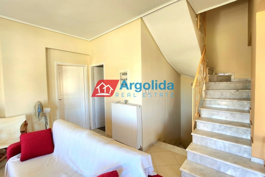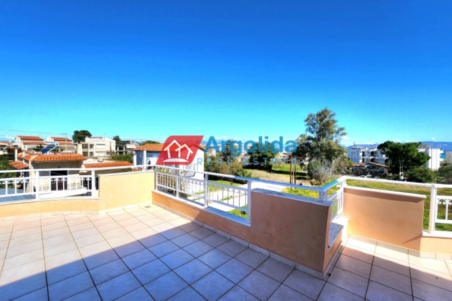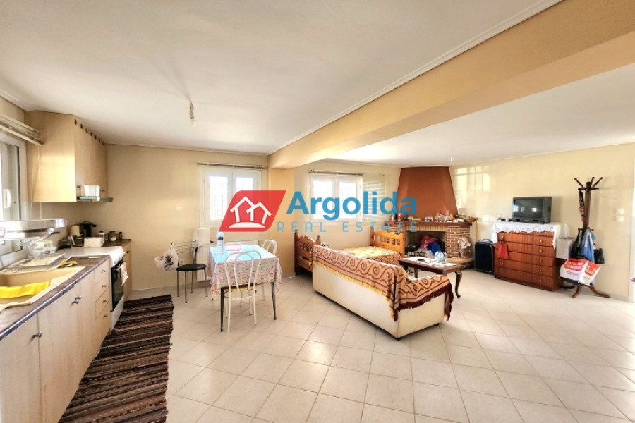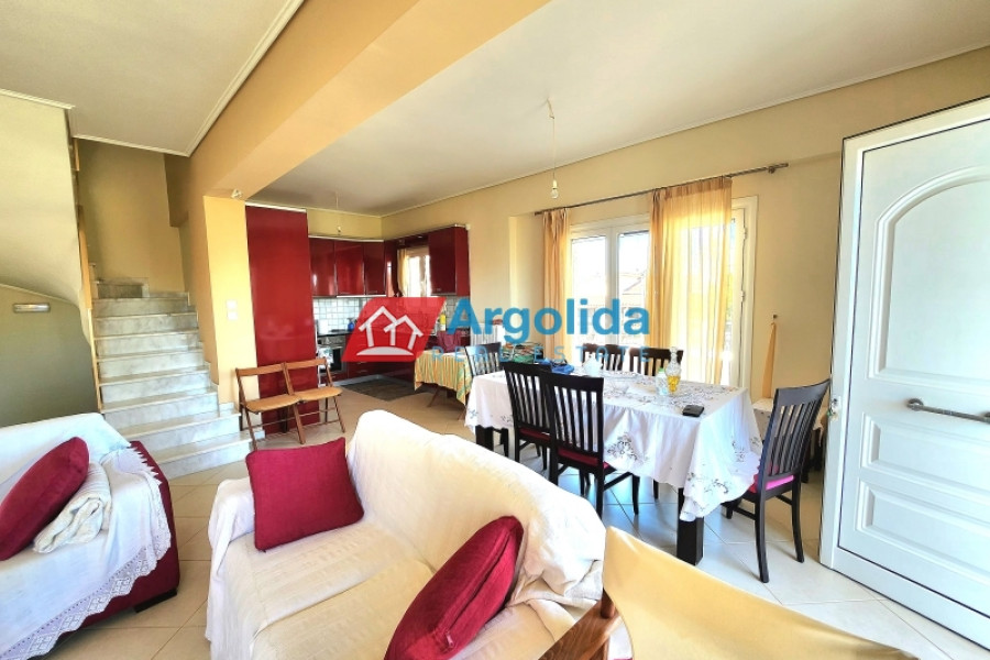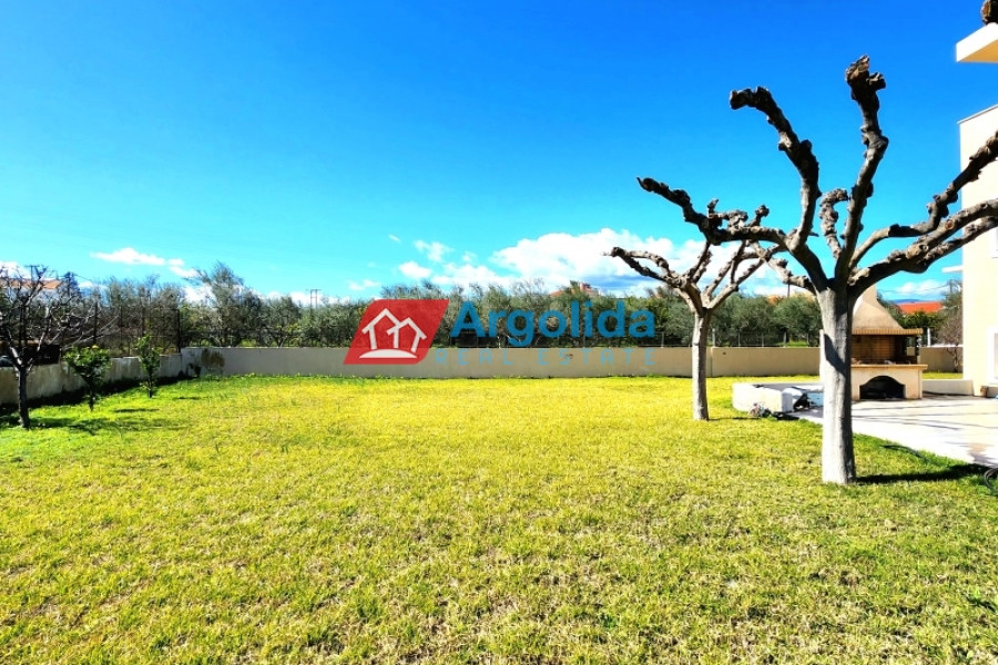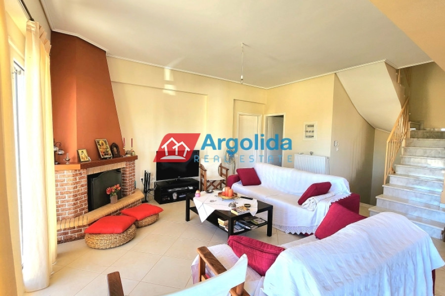 In Nerantza Corinthia, very close to Vrachati, a 216m² independent detached house on a plot of 971m² inside the settlement is for sale. A great advantage of this property is that it consists of two adjoining plots and is only 180 meters from the sea. The first plot has an area of 521m² and contains the three-level house, while the second plot has an area of 449m² and has the right to build 240m². The main home has its entrance on the elevated ground floor (81m²) leading to the spacious living-dining area with fireplace and a large equipped kitchen. There is also a guest bathroom and one (1) master bedroom with its own bathroom with hydromassage. On the first floor (54m²) we find two (2) bedrooms with built-in wardrobes, one (1) large bathroom with a hydromassage shower and an office/sitting room that can easily be converted into a further bedroom. All areas of the residence have access to large terraces with unobstructed views. In the semi-basement (41m²) we find a guest apartment with its own entrance (supplementary to the internal staircase) which has a large open-plan lounge-dining-kitchen area with fireplace, storage/wardrobe as well as a bathroom with shower. On the same level there is a closed garage plus boiler room and storage space. The house has aluminum frames with double glazing and screens, all the railings on the terraces are aluminum, oil heating with radiators and with autonomy on each level, triple energy solar water heater, built-in electrical appliances, armored security door, alarm, two fireplaces and exterior BBQ. The plot is perimetrically walled and fenced , the area around the home is paved while the balance of the plot has expansive lawns and ample space for the construction of a swimming pool. It is located in a quiet area with country houses.