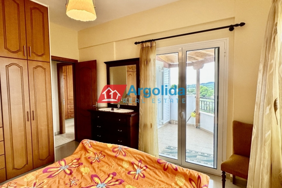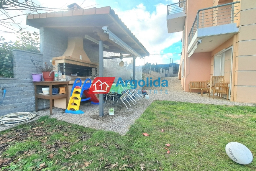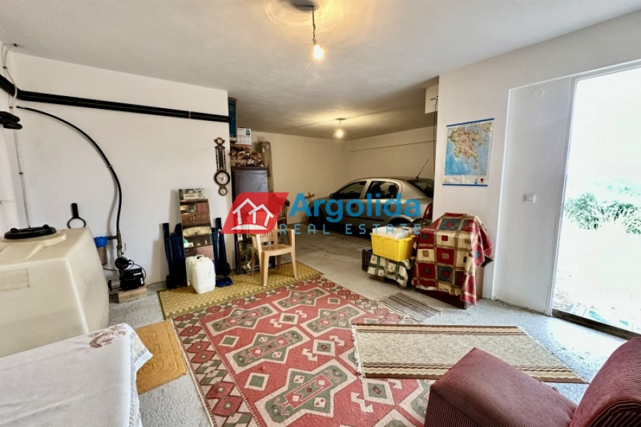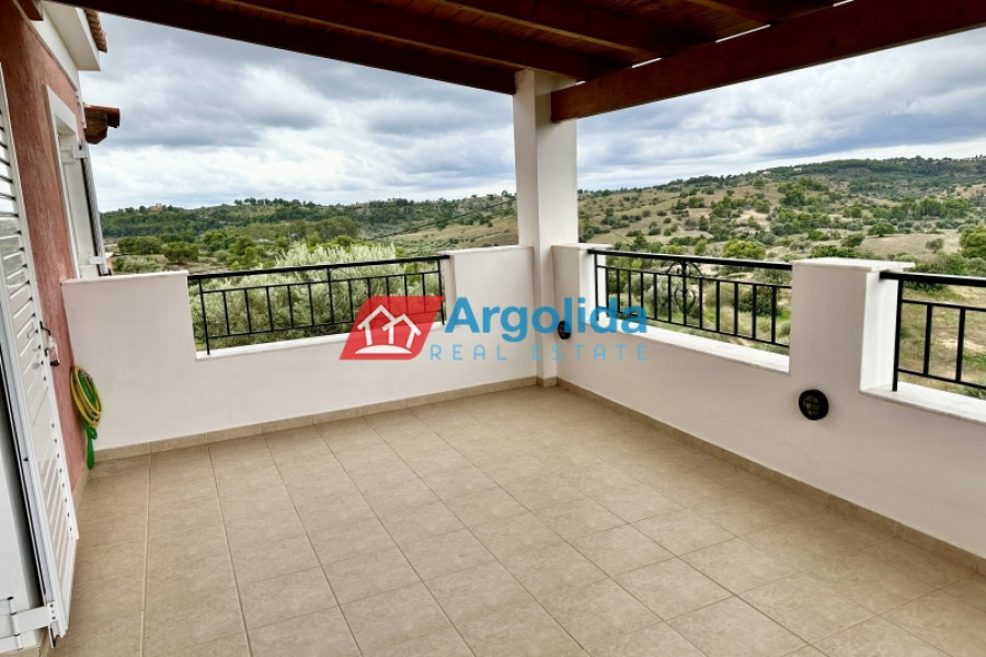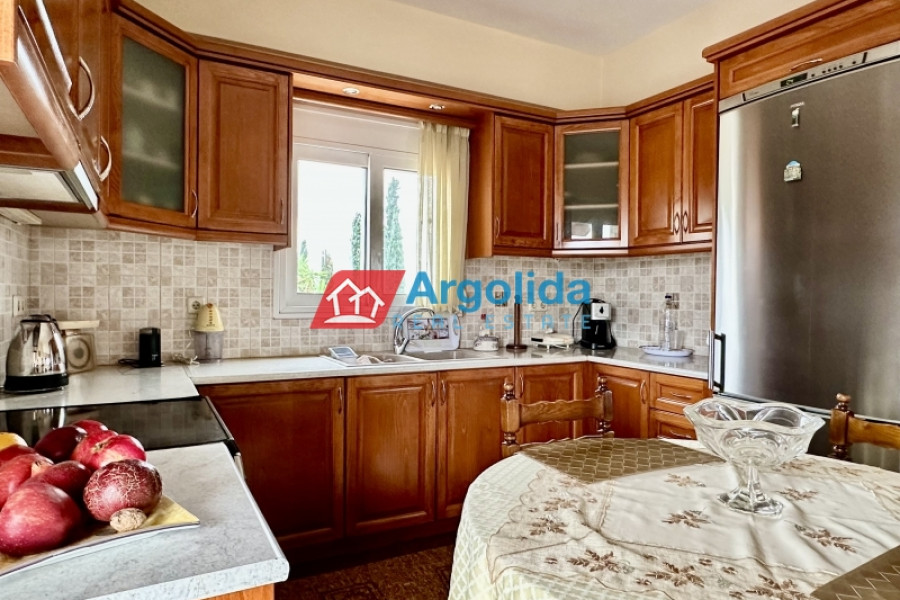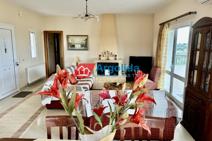 Just outside Kranidi, in a peaceful and green location next to the municipal tennis courts, a 210 sq.m. villa is available for sale within an 8,000 sq.m. plot, offering privacy, comfort, and panoramic views of the sea and countryside. The residence is developed on two levels: the first level (110 sq.m.) features a spacious open-plan living and dining area, a semi-separate kitchen, a guest WC, a main bathroom, and two bedrooms, while the second level (100 sq.m.) includes two spaces – one with a boiler room and closed parking, and another in semi-finished condition that can be transformed into a fully independent residence. The fenced plot is planted with productive olive trees and includes an additional 2,000 sq.m. inner enclosure surrounding the main house. There is also potential for a swimming pool, BBQ area, or garage, making it a highly versatile property. Its location is excellent, just 4.5 km from the nearest beach, 2 km from Kranidi with shops and services, 7 km from Porto Heli, and 200 km from Athens International Airport.