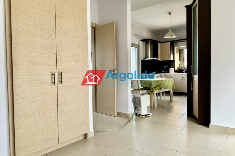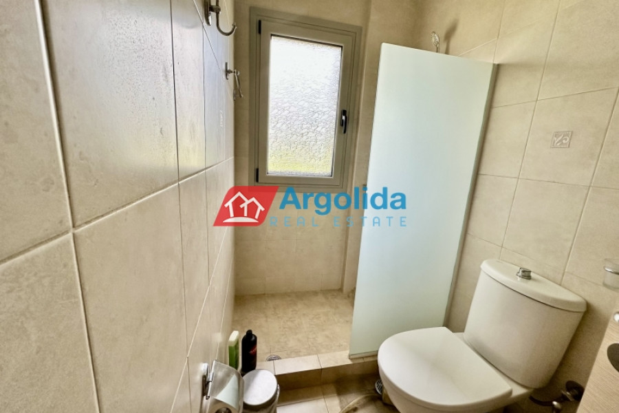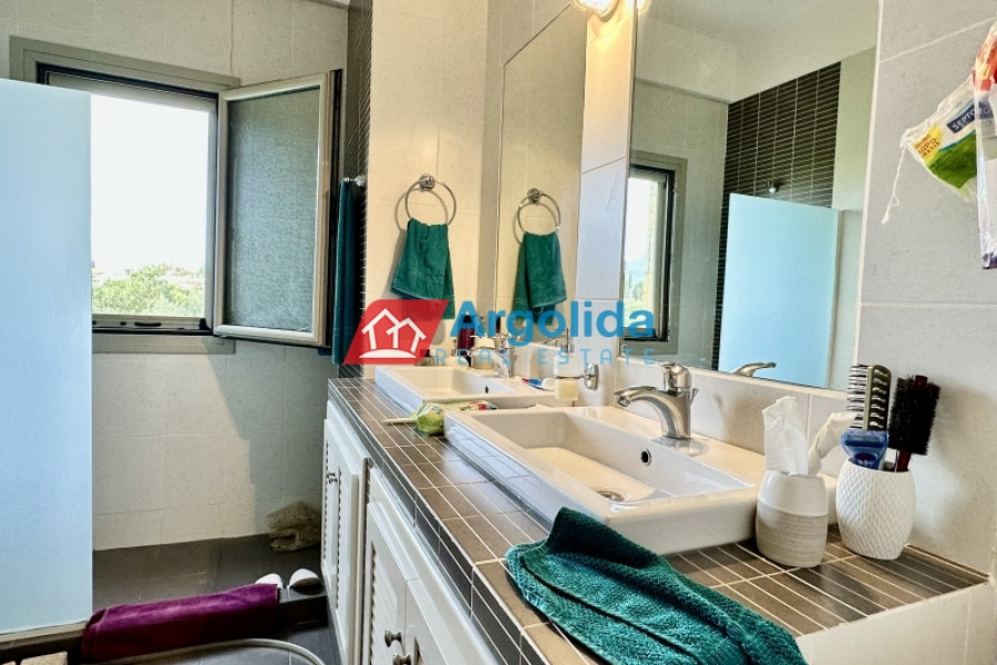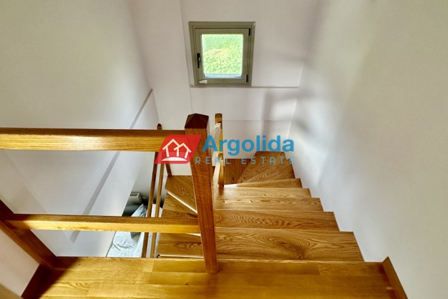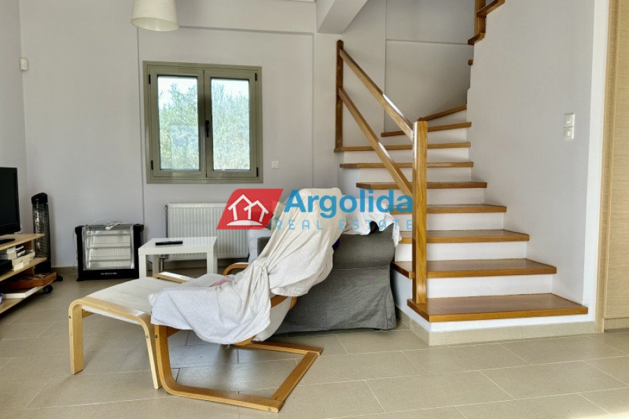 In the Elainas area of the Diakopto municipality, a 170 sqm detached house in excellent condition (like new) is for sale on a 765 sqm plot. Built in 2013 with high standards, it was designed for owner occupation. The ground floor features a living room with fireplace, a semi-separate kitchen, one WC, and one bedroom with en-suite bathroom. Upstairs, with oak flooring, there are three bedrooms, one bathroom, and a large balcony with mountain views. The property boasts a beautiful and landscaped outdoor area with trees and plants. It is located just 400 meters from the organized beach and 2,000 meters from the "Diakopto" suburban railway station.
