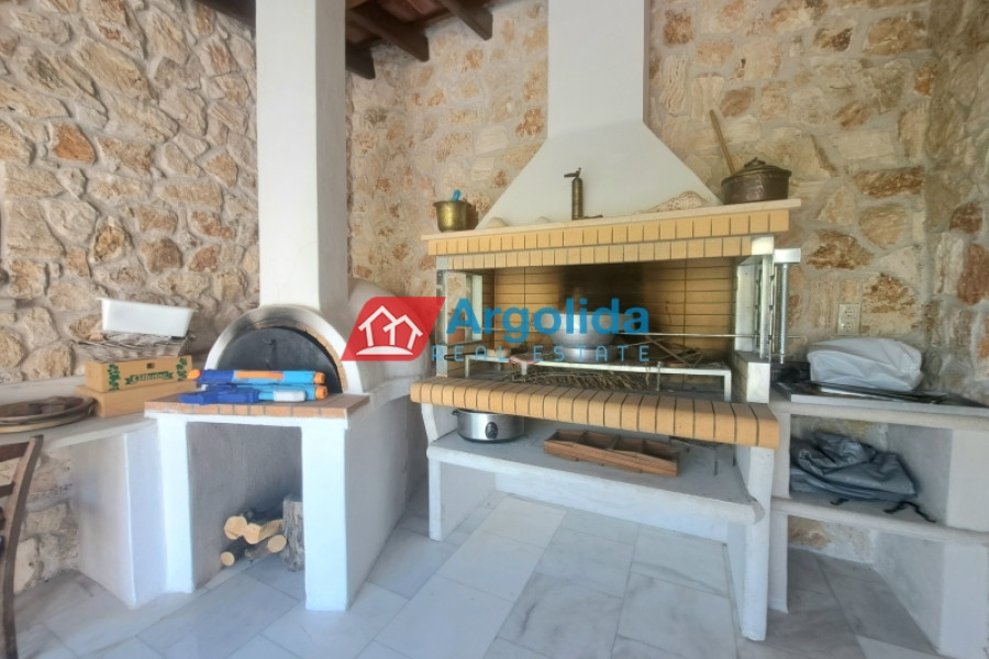 There is a separate two-car gargage with an adjoining a storeroom (25 sq.m.) along with a laundry room and a kitchen, as well as a large area with a BBQ, a wood-burning oven and a sink. The garden also contains several mature olive trees. The home is only 5 kilometers from the suburban railway with a direct route to Athens airport.