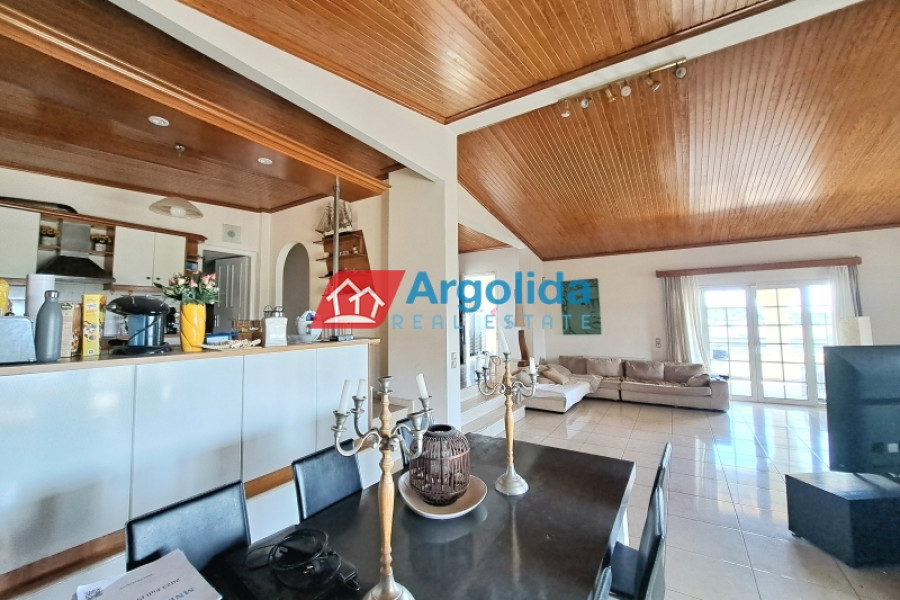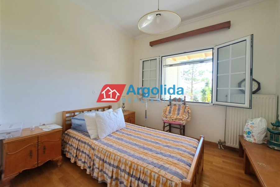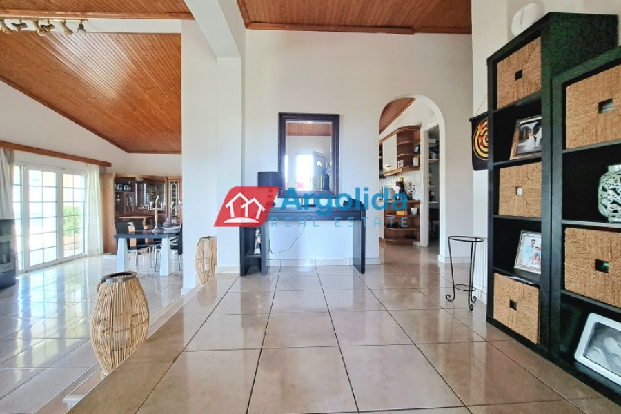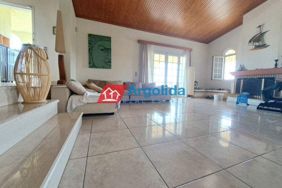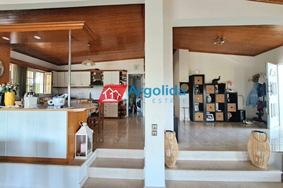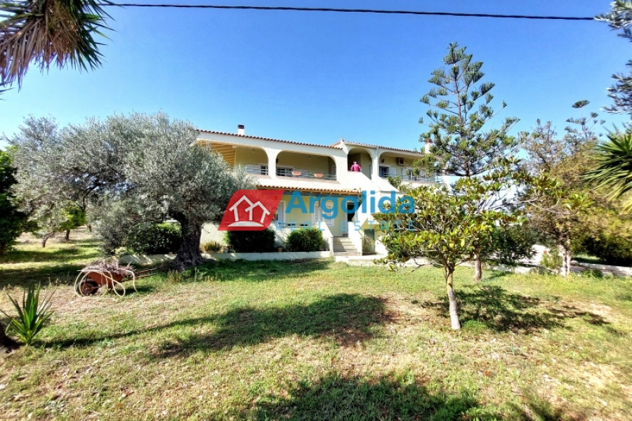 Nestled in a lush green landscape near the renowned Porto Heli, this unique detached house of 400 sqm on a 6,500 sqm plot offers privacy, comfort, and direct contact with nature, comprising two independent apartments ideal for family use or guest accommodation, as well as a spacious 170 sqm storage area, the raised ground floor features an open-plan living, dining and kitchen area with direct access to a terrace, two bedrooms with fitted wardrobes, and a bathroom, while the first floor includes a spacious living-dining area with fireplace, open kitchen, three bedrooms with fitted wardrobes, one en-suite, plus an additional shared bathroom, all rooms with access to balconies or terraces overlooking nature, the outdoor area boasts a garden with 80 olive trees, mature citrus trees, free space for a potential pool, a BBQ area with outdoor seating, offering ideal conditions for relaxation and entertaining, and the location, just 6 minutes from Porto Heli and Kranidi, ensures easy access to beaches, local amenities, and stunning landscapes, making it a perfect choice for those seeking a spacious and functional home surrounded by nature, close to the sea.