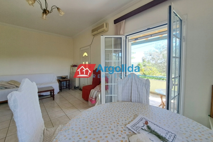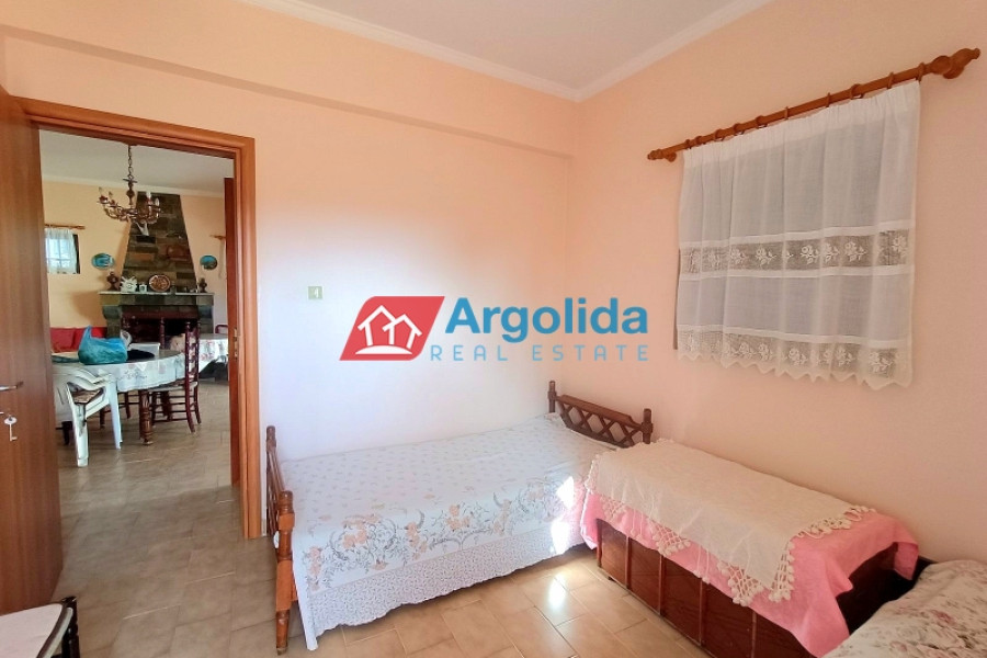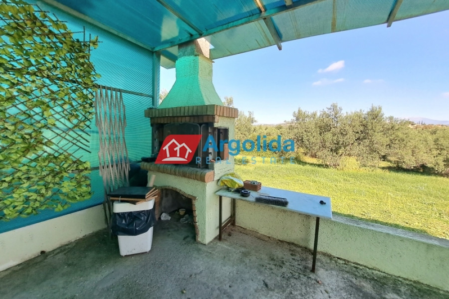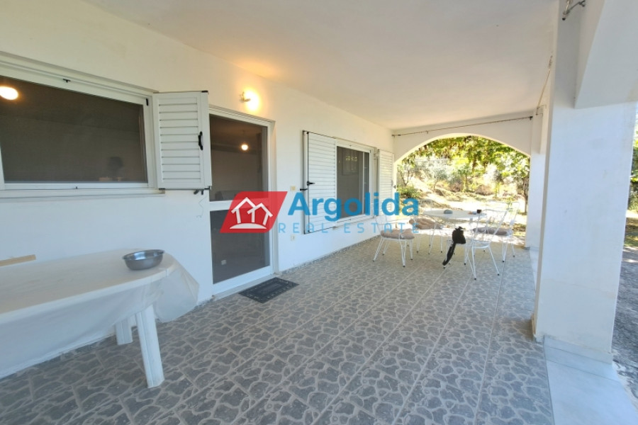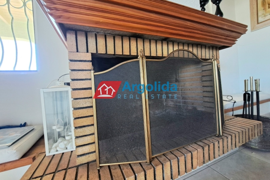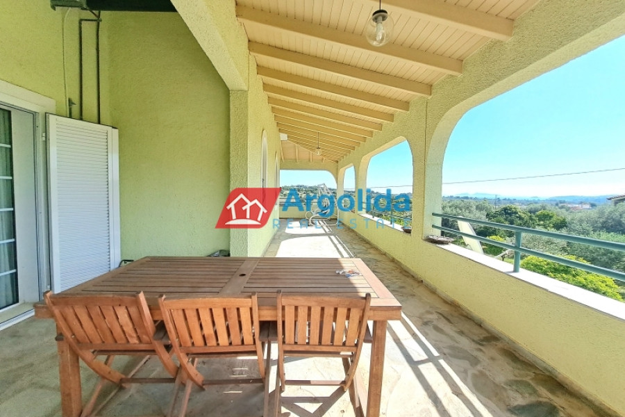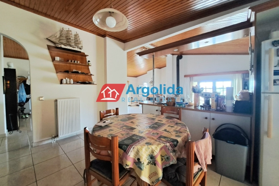 Nestled in a lush green landscape near the renowned Porto Heli, this unique detached house of 400 sqm on a 6,500 sqm plot offers privacy, comfort, and direct contact with nature, comprising two independent apartments ideal for family use or guest accommodation, as well as a spacious 170 sqm storage area, the raised ground floor features an open-plan living, dining and kitchen area with direct access to a terrace, two bedrooms with fitted wardrobes, and a bathroom, while the first floor includes a spacious living-dining area with fireplace, open kitchen, three bedrooms with fitted wardrobes, one en-suite, plus an additional shared bathroom, all rooms with access to balconies or terraces overlooking nature, the outdoor area boasts a garden with 80 olive trees, mature citrus trees, free space for a potential pool, a BBQ area with outdoor seating, offering ideal conditions for relaxation and entertaining, and the location, just 6 minutes from Porto Heli and Kranidi, ensures easy access to beaches, local amenities, and stunning landscapes, making it a perfect choice for those seeking a spacious and functional home surrounded by nature, close to the sea.