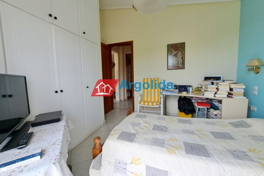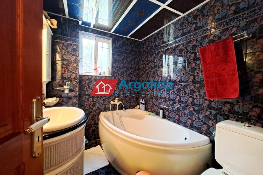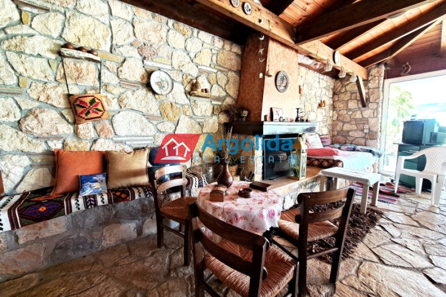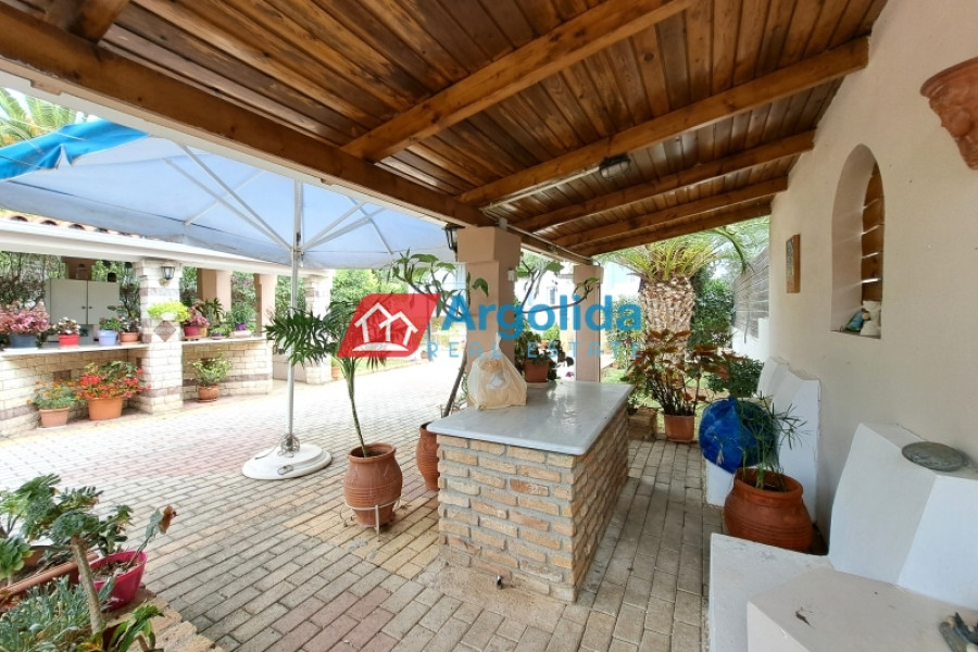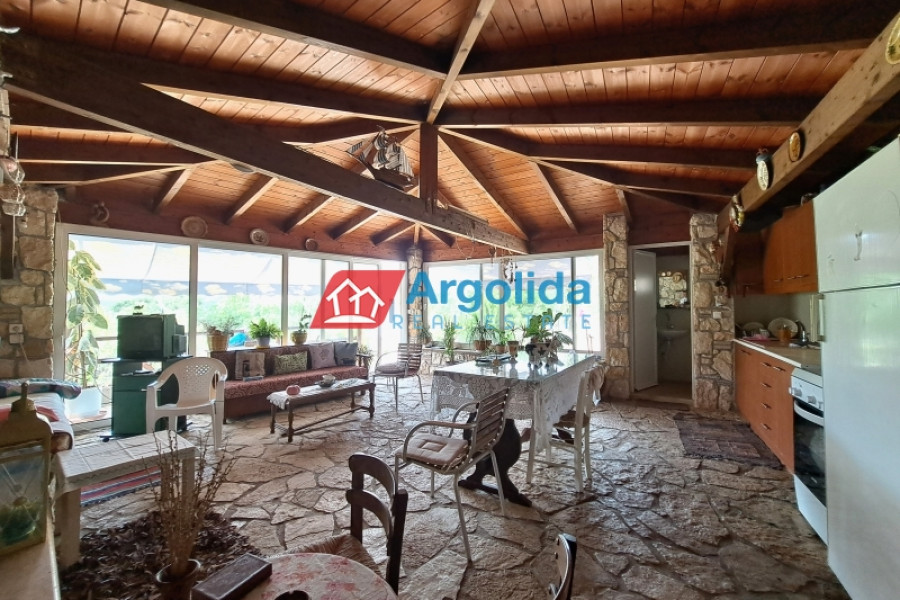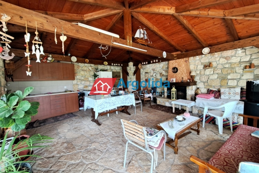 This stunning, executive property in Kechries, a small community not far from Corinth, enjoys the tranquil countryside with only a short six-minute drive from the coast and beaches.The main home, with a total area of 140m², is spread over three levels. The elevated ground floor entrance opens on to the lounge-dining area with a fireplace and the adjacent, well-appointed kitchen. The level has a large bedroom and a bathroom.Upstairs, there is a further sitting room and two bedrooms with built-in wardrobes and a family bathroom. All these rooms enjoy access to an expansive balcony with unimpeded sea views.A semi-basement level offers space which serves as a playroom/extra bedroom plus there is a large storage area.A 45m² independent guest house, beautifully designed with exposed stone and wood elements, sits at a short distance from the main home on the 1000m² grounds. It is totally open plan with a full kitchen and dining facilities and sitting area with a fireplace plus a bathroom.Furthermore the grounds include a roofed built-in barbeque/outdoor kitchen area with an adjacent pergola as a sitting/dining area situated around a large courtyard. Also within the grounds is waterfall feature and a small chapel. Walled and fenced with a security entrance, the mature fruit and shade trees offer privacy on the landscaped grounds. The gardens are serviced by an automatic irrigation system.Just a six-minute drive from the swimming beach of Kechries, and ten minutes from the Suburban Rail station which offers hourly connections with the Athens Metro/Airport, this lovely home offers peace and tranquility without isolation.