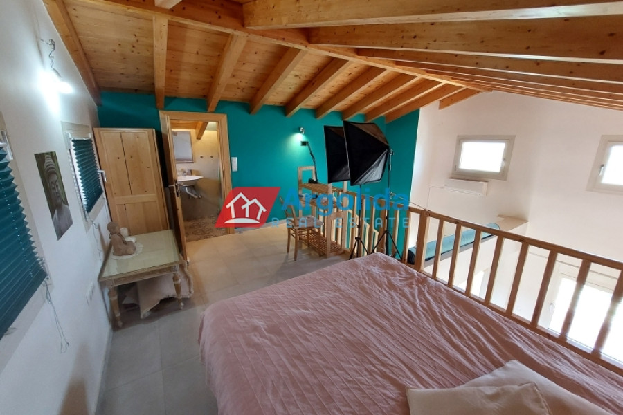 Property Code: 12261 - House FOR SALE in Velo Poullitsa for € 500.000 . This 300 sq. m. House is on the Ground floor and features 6 Bedrooms, 4 Livingrooms, 3 Kitchens, 4 bathrooms and 3 WC. The property also boasts Heating system: Heat pump, tiled floor, view of the Sea, Window frames: Aluminium, Security door, accessibility for people with disabilities, parking, a storage unit sqm, garden, fireplace, A/C, alarm system, electrical appliances, insect screens, double-glazed windows, solar-powered water heater, entry stairs, BBQ, playroom, open space, internal staircase. The building was constructed in 2012 Plot area: 1755 s.q. . Building Energy Rating: B Distance from the city center: 8500 meters, Distance from nearest village: 800 meters, Distance from nearest airport: 131000 meters, This remarkable residence, in a tranquil country setting with unimpeded 360 degree views, was created by the owner to serve her wellness seminar/retreat business. Using only the finest of materials and finishings to create a home with exceptional aesthetics and the highest standards of energy efficiency, this large house, with multiple bedrooms and bathrooms, has the option to be divided into two, perhaps three residences.The home is built over three levels and also has an attic/loft. The lower two levels have been designed for access for mobility challenged individuals by ramps carefully incorporated in the original design with wide doorways and step-free showers. Although joined by an internal staircase, each of the levels can operate as an autonomous residence with an independent entrance.The current layout has the main entrance elevated ground floor (130m²) which also has wide sweeping wraparound verandas of over 95m² and is accessed by either stair or ramp. This level also has an expansive lounge, a separate kitchen-dining room, two bedrooms, a main bathroom and two guest bathrooms. The first floor (88m²) has two master bedrooms (one in the loft space) each with their own ensuite bathroom. There is a large open plan lounge-dining-kitchen area. The level opens on to a wide wraparound balcony (63m²) which offers stunning views from the Corinthian Gulf, over the plains to the distant mountains.The semi-basement level (81m²), also with both stair and ramp access, also has a lounge-dining room with a separate kitchen, two bedrooms and a main bathroom. Alongside there are two large storage rooms, one of which also houses the boiler for the central heating system.The expansive grounds, which are walled and fenced with a gated entrance, offer many landscaping options along with a roofed barbeque-dining area, a pergola and onsite parking for a number of vehicles.Located near Poullitsa, a small village, just 3½ km from the sea and beaches of the area, it also has easy access to Athens/Airport, at just a 75 minute drive and the nearby train station at Zevgalatio offers hourly Suburban Train links with Athens Metro.