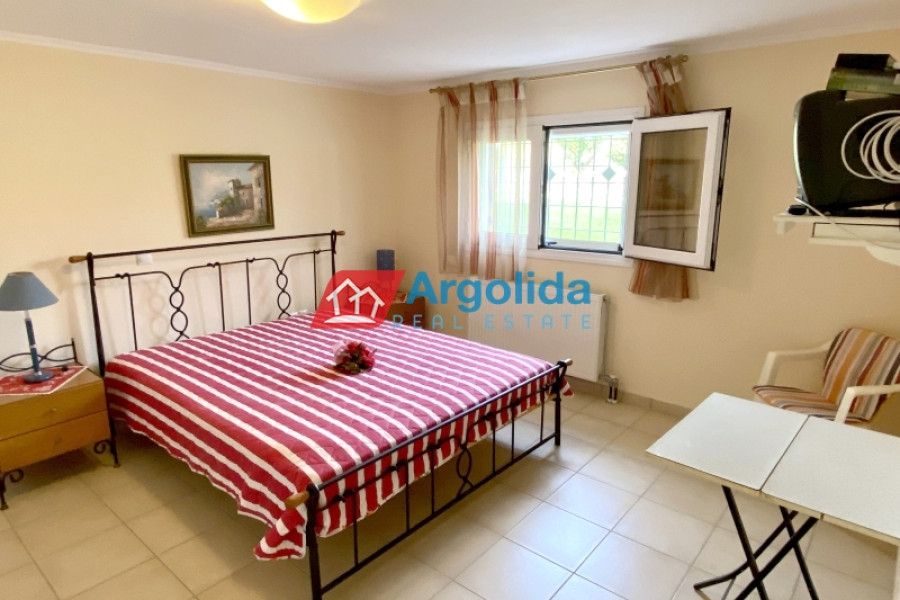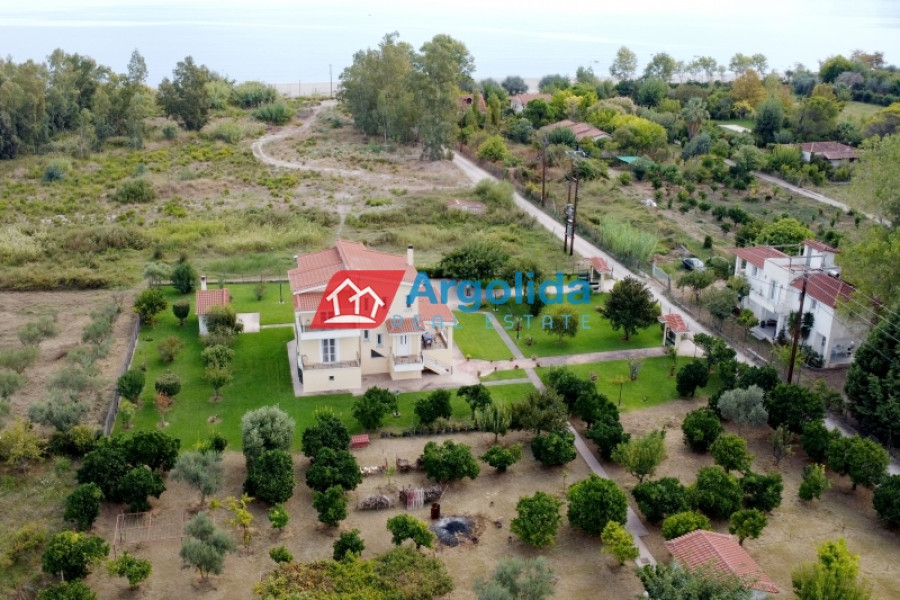 Just 170 meters from the beach, this seaside detached house, built in 2005, sits on a 4,432 sqm plot and offers a perfect blend of comfort, privacy, and quality construction. The residence features 180.21 sqm of main living areas and 107.65 sqm of auxiliary spaces, including an independent guesthouse with private bathroom and a closed parking area. The main house comprises four bedrooms (including two master suites), three bathrooms, and one WC. All rooms are equipped with air conditioning, a monitored alarm system, and an intercom network. The outdoor area is beautifully landscaped with lawn, fruit trees, outdoor lighting, and a covered BBQ area with WC, creating an ideal environment for relaxation and entertaining. The property has three entrances, one with a remote-controlled car gate and an additional sliding gate. It also includes a certified private borehole with automatic irrigation, a sewage treatment system, stormwater pumps, and a diesel generator that activates automatically in the event of a power outage. Water supply is provided by the municipal network, and a water sensor on the ramp is connected to the security system for enhanced safety and convenience. This is an exceptional property ideal for a permanent or holiday residence, fully equipped for comfortable year-round living.