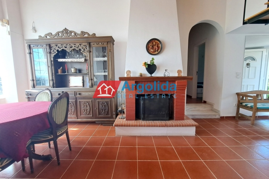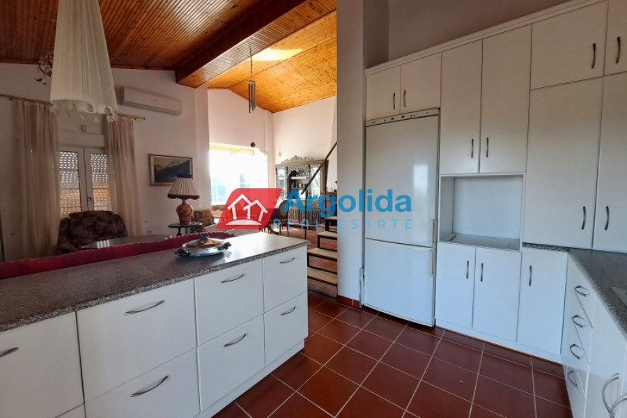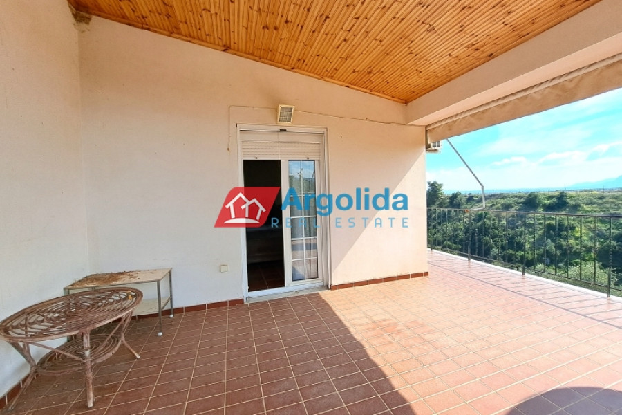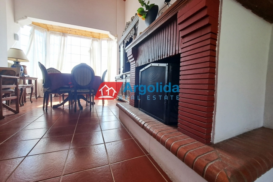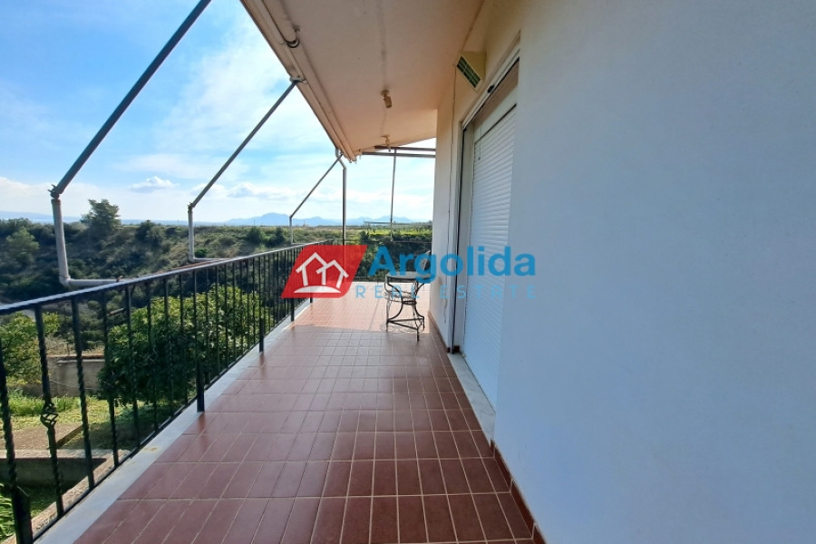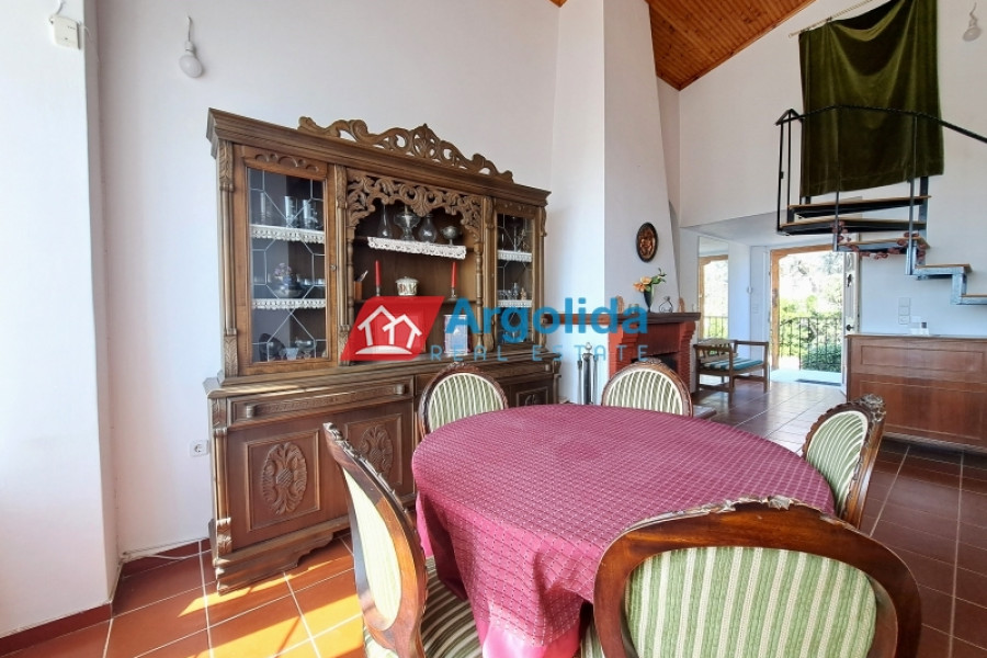 This beautiful home, built on a hillside overlooks the entire surrounding area from the mountains, down to the sea and the Gulf of Corinth. Set well back from the road, this home offers a dual residence. The main home (101m²), sold fully furnished, is on the first floor with an entrance leading on to the lounge-dining area with a fireplace and a well-designed, spacious kitchen with its own entrance. A few steps lead up to two of the bedrooms which have built-in wardrobes and access to the balconies. These bedrooms share a bathroom. The high sloped ceilings in the lounge offer space, light and a closed loft area which serves either as a third bedroom or a home office/playroom. A secondary bathroom services this room and doubles as a guest bathroom. The wrap-around balconies offer unimpeded panoramic views. The 97m² lower level, taking advantage of the incline of the grounds, has an independent space with the laundry plus storage space which also houses the boiler for the central heating system. The balance of the floor is given over to an independent, as yet unfinished, two-bedroom apartment with an open-plan lounge-dining area and a semi-separate kitchen. There is existing pre-installation for plumbing, electrics and heating system. The level opens on to the gardens and has beautiful views down to the sea. The grounds of the home (2000m²) are perimetrically walled and fenced and the landscaped gardens, with gardens and mature trees, include a pergola seating area, an outdoor kitchen, a barbeque area, a carport built over underground water tanks and an adjacent olive grove (2000m²) which is part of the property. Only 3km from the nearest facilities (supermarket, pharmacy etc) and 5.5km from the sea and nearest beach, this home offers a peaceful country lifestyle without being isolated. Easy access from the motorway means Athens/Airport is just a 75 minute drive, making the property ideal for either a summer home or a permanent residence.