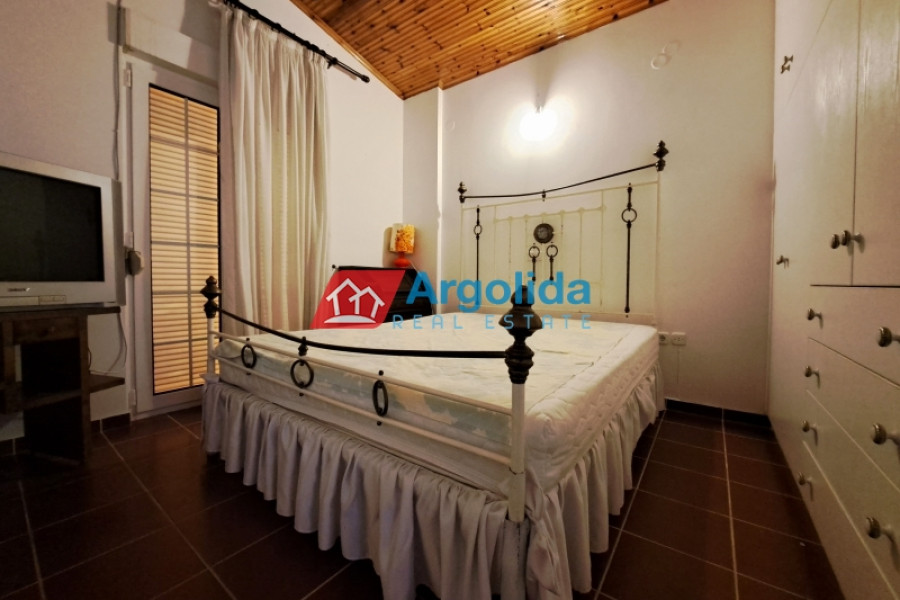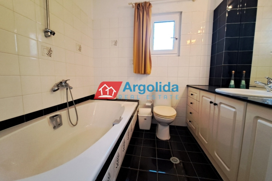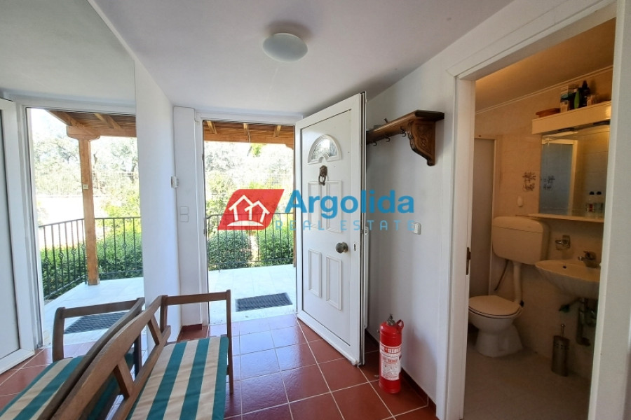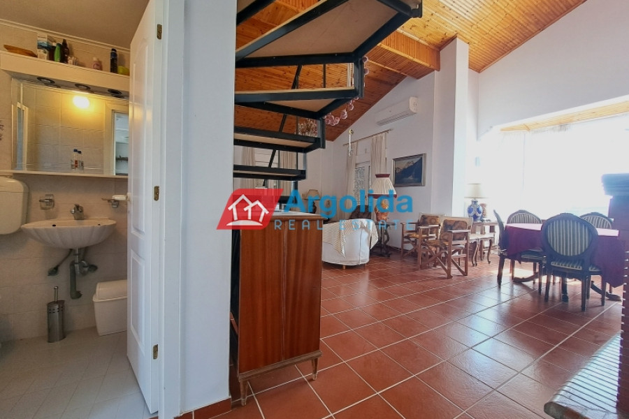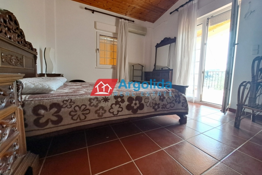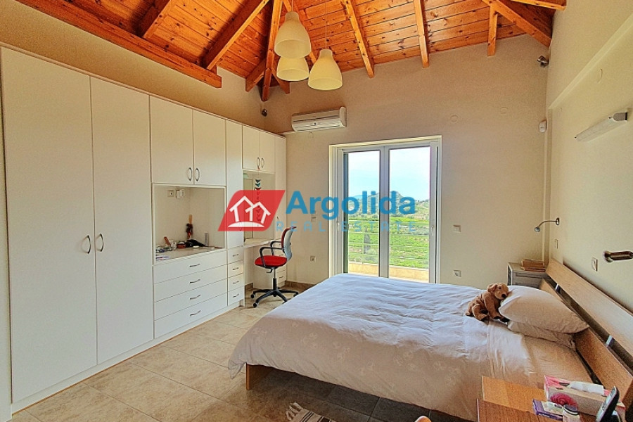 This beautiful home, built on a hillside overlooks the entire surrounding area from the mountains, down to the sea and the Gulf of Corinth. Set well back from the road, this home offers a dual residence. The main home (101m²), sold fully furnished, is on the first floor with an entrance leading on to the lounge-dining area with a fireplace and a well-designed, spacious kitchen with its own entrance. A few steps lead up to two of the bedrooms which have built-in wardrobes and access to the balconies. These bedrooms share a bathroom. The high sloped ceilings in the lounge offer space, light and a closed loft area which serves either as a third bedroom or a home office/playroom. A secondary bathroom services this room and doubles as a guest bathroom. The wrap-around balconies offer unimpeded panoramic views. The 97m² lower level, taking advantage of the incline of the grounds, has an independent space with the laundry plus storage space which also houses the boiler for the central heating system. The balance of the floor is given over to an independent, as yet unfinished, two-bedroom apartment with an open-plan lounge-dining area and a semi-separate kitchen. There is existing pre-installation for plumbing, electrics and heating system. The level opens on to the gardens and has beautiful views down to the sea. The grounds of the home (2000m²) are perimetrically walled and fenced and the landscaped gardens, with gardens and mature trees, include a pergola seating area, an outdoor kitchen, a barbeque area, a carport built over underground water tanks and an adjacent olive grove (2000m²) which is part of the property. Only 3km from the nearest facilities (supermarket, pharmacy etc) and 5.5km from the sea and nearest beach, this home offers a peaceful country lifestyle without being isolated. Easy access from the motorway means Athens/Airport is just a 75 minute drive, making the property ideal for either a summer home or a permanent residence.