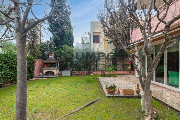 The outdoor area features a landscaped garden with trees and a BBQ area, creating a pleasant environment for relaxation and entertaining. There is also the possibility of building a swimming pool.