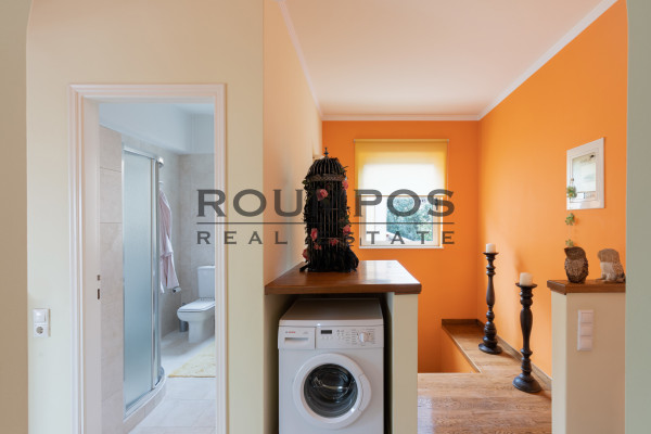 Upon entering the property, there is a spacious and bright living room with a fireplace, marble flooring, and large openings with direct access to the garden. On the same level there is also a separate, functional and comfortable kitchen, as well as one WC.