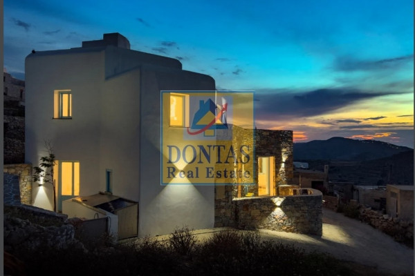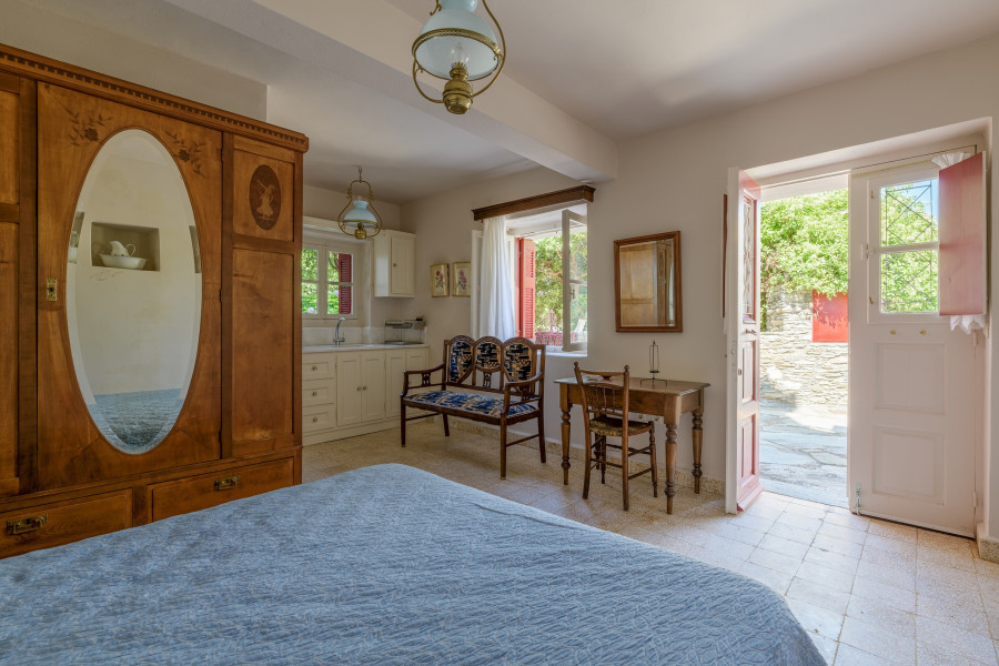 The main residence occupies 2 levels. The first level features a living/dining room with a fireplace, a kitchen with an additional dining area, and a W.C. The living room opens to a beautiful terrace with a unique view of the island and the sea.