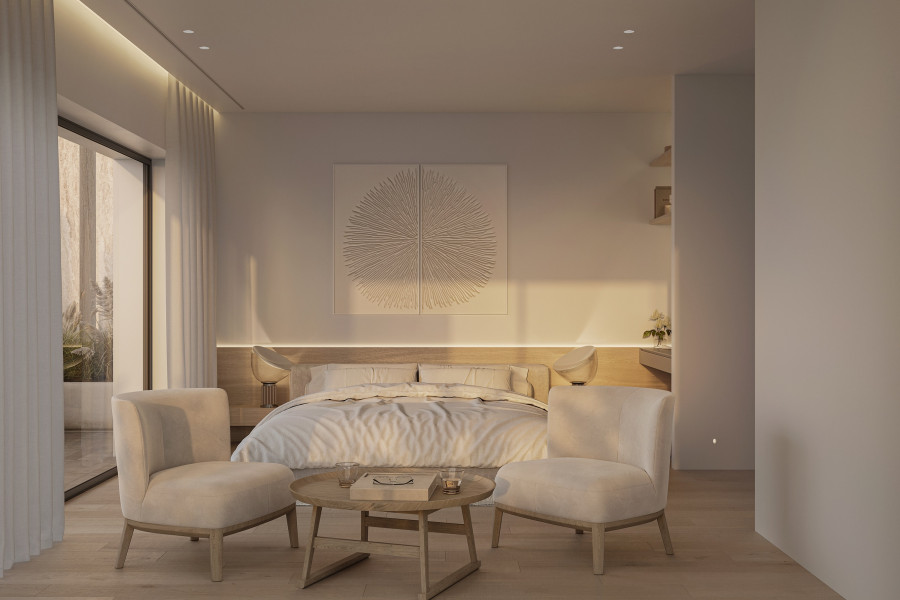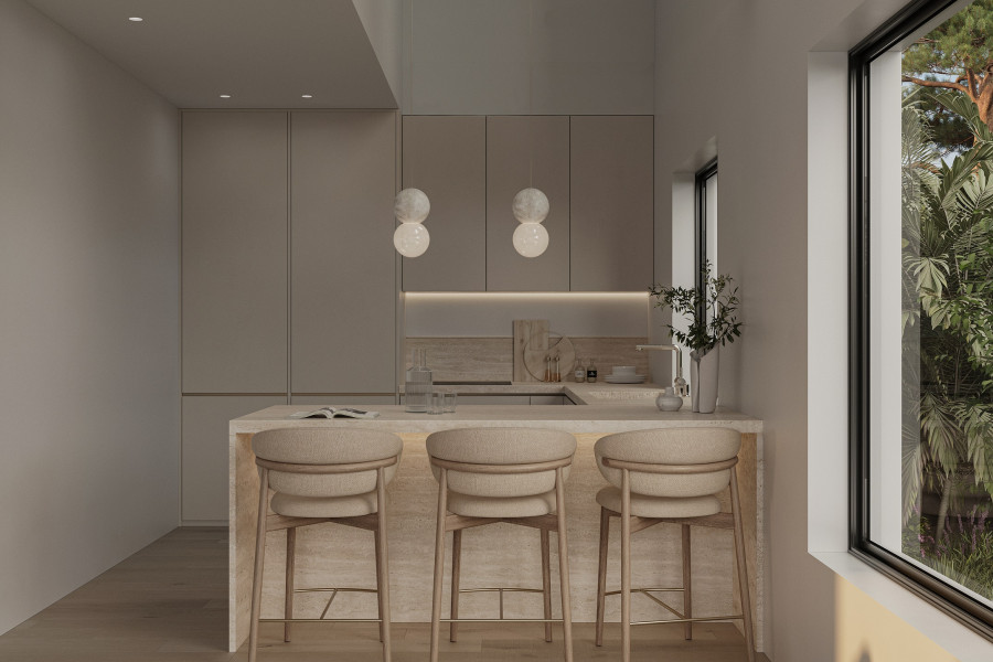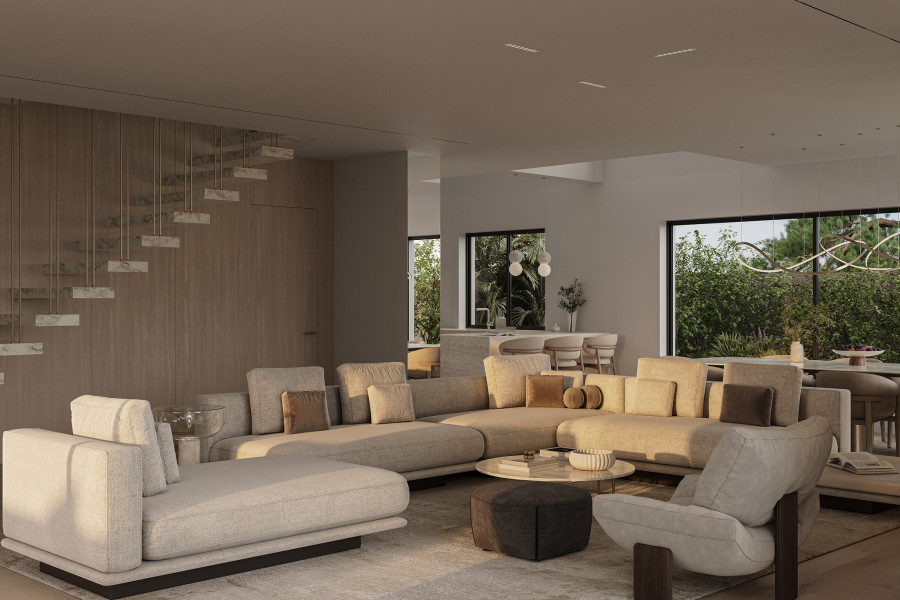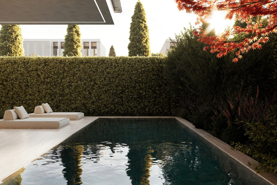 The ground floor of 84sq.m. features a luminous open-plan layout with a living room, a dining area and a kitchen, all with direct access to the garden and the pool. An elegant internal staircase leads to the 1st floor of 86sq.m., which offers 2 spacious en-suite bedrooms opening onto a balcony overlooking the garden.