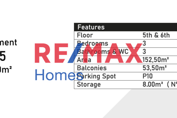 Maisonette under construction for Sale in Alimos, with sea view. The property is 152.50 sqm, 86.50 sqm of which are on the 5th floor and 66.00 sqm are on the 6th floor. The property consists of 3 bedrooms (1 master), 2 baths, 1 WC, 1 kitchen, 2 living rooms, and 1 parking spot (in basement). The property has two access points, one per level. It will be delivered in 2 years and is constructed with high seismic resistance in mind, waterproofing the roof and the parking, floor and room soundproofing, and A+ energy class. The property has independent heating, through heat pumps, floor heating and VRV ventilation. It comes with solar water heater, boiler, noise isolation, thermal insulation, Double sided Aluminum window frames: ALUMIL and tile flooring. The property will be basked in natural light, and the refreshing seaside breeze. It is located 150m away from the subway, and will be equipped with: Electric roller blinds, Sieves, storage, LED lighting, three-phase current, automatic watering, electric car charging, smart home installation, solar panels. Upon completion the prospective owner will be given full access to all equipment certifications, guarantees and manuals, pipping mappings, a list of workshops. Pets are allowed. Good and Quiet neighborhood, public transit readily available, Supermarket and Mall nearby. Property code (D14). Managing Partner Code ( AS01). RE/MAX Homes, Certified Brokers by HEL.I.C (Hellenic Certification Institute), contact phone: 2109834265, email: