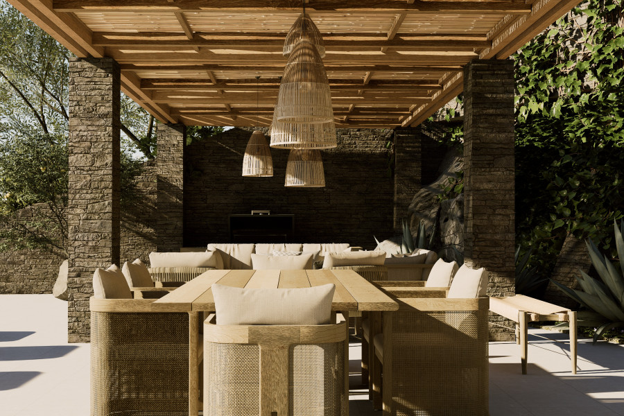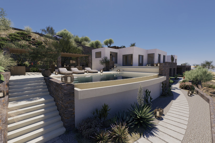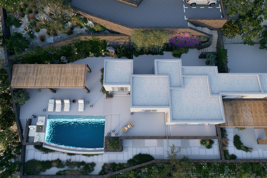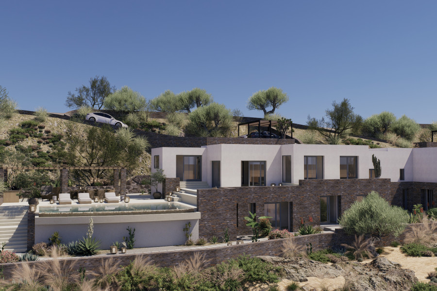 Currently under construction, the property sits on a 4,000 sq.m. plot, shared with one more residence. It occupies 218sq.m., enjoys exclusive use of 1,500sq.m. of land, and unfolds over 2 levels.