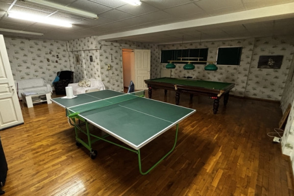 The ground floor features a large living room with fireplace, a spacious kitchen, and direct access to the garden and swimming pool. The upper floors include three bedrooms with en-suite bathrooms, while the property also offers a playroom with billiards, staff room, and additional utility spaces.