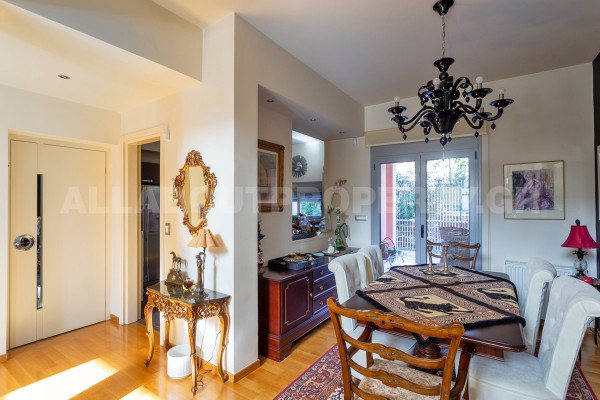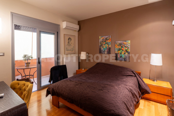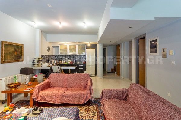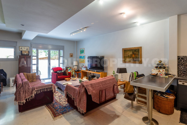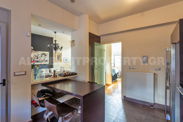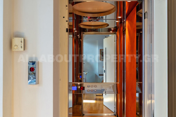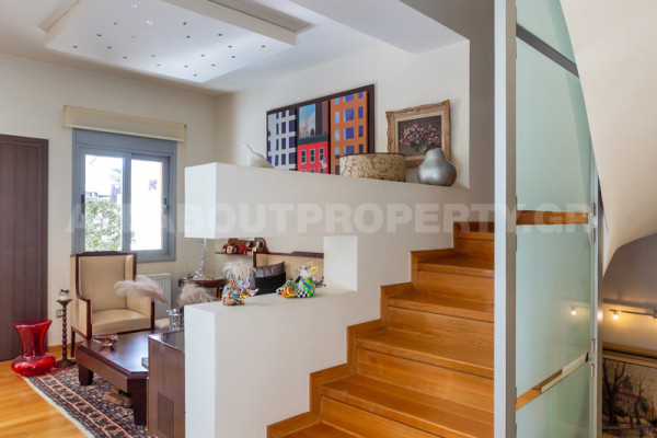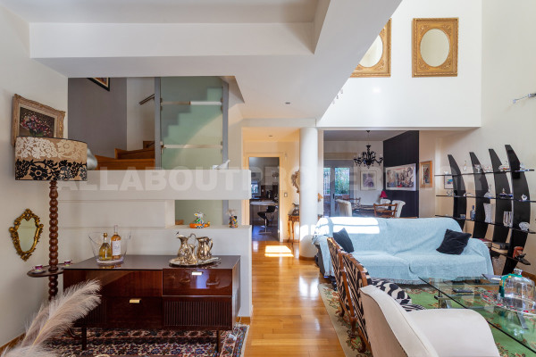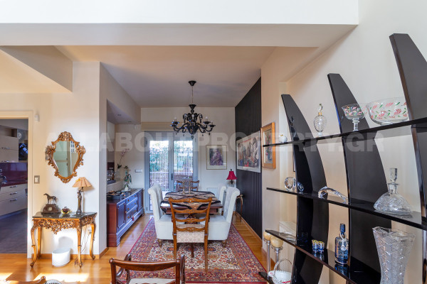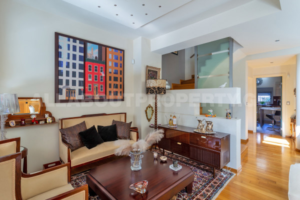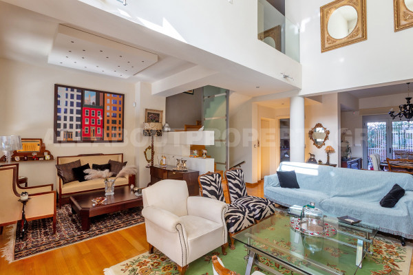 The maisonette is developed on three levels and served by an internal elevator, offering comfort and functionality in everyday life. On the ground floor one finds an impressive double-height living room with fireplace, dining room and kitchen, creating an ideal space for family life and hospitality. On the upper level there are three bedrooms, one of which is a master, as well as two bathrooms, while there is access to a roof terrace with the possibility of forming a roof garden, adding significant capital value and an additional relaxation area.