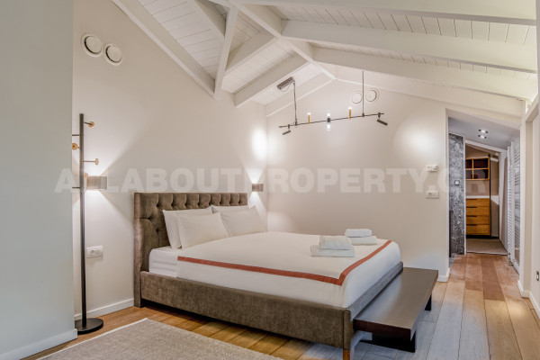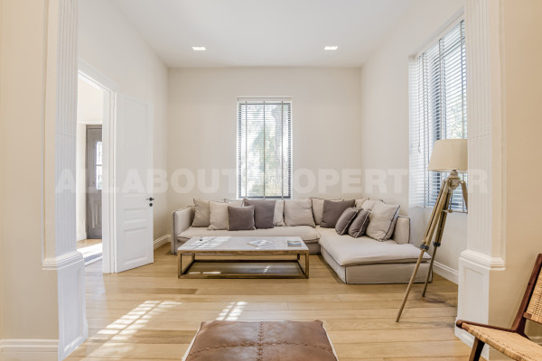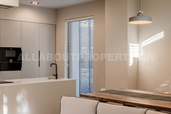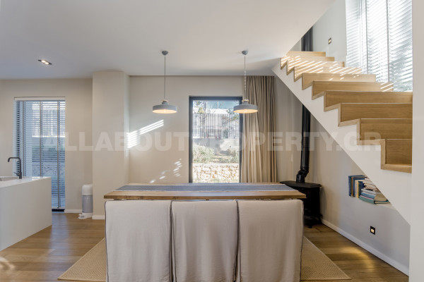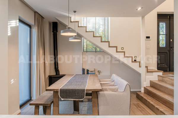 Η κατοικία είναι 208τμ και αναπτύσσεται σε δύο επίπεδα. The ground floor which is 133sqm offers a beautiful very high-ceilinged living room with fireplace, dining room, open kitchen with built-in electrical appliances, 1 bedroom and 1 bathroom. The internal staircase leads to the loft which has a second sitting area/office open to the lower level, 1 bedroom, 1 bathroom and cloakroom. Other amenities include a 50sqm basement warehouse, 2 parking spaces on the plot, underfloor heating/cooling with heat pumps, boiler, alarm, etc.