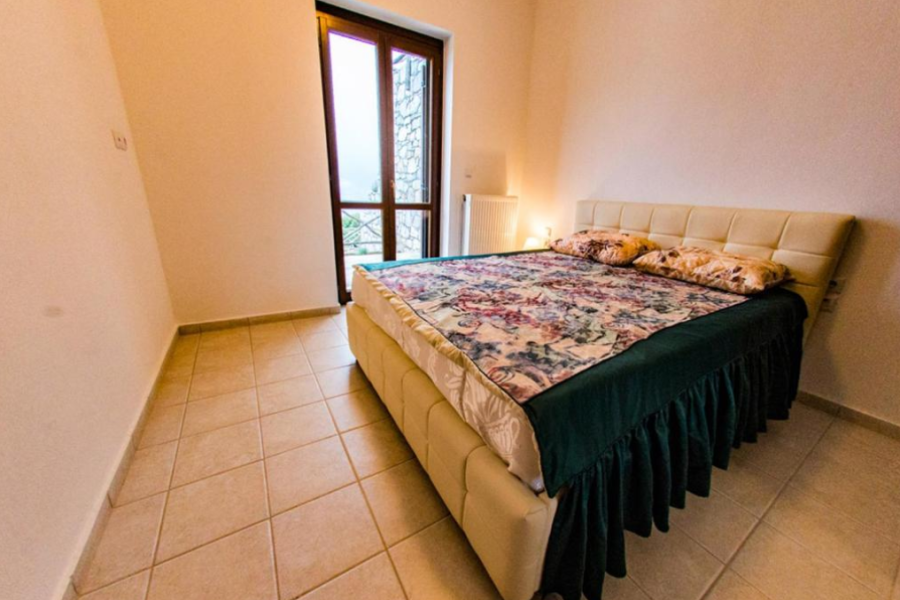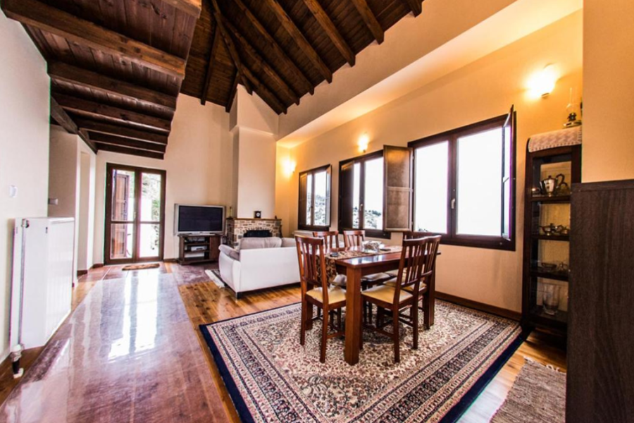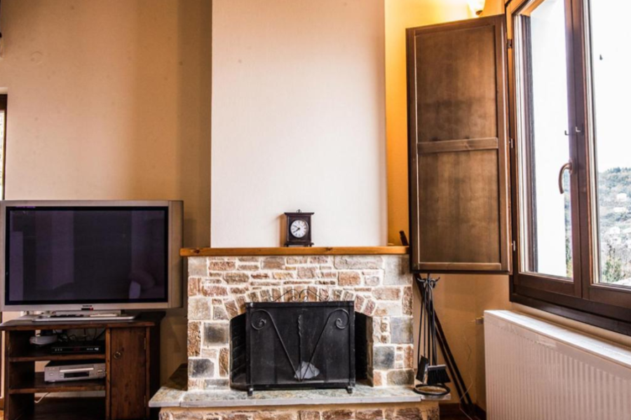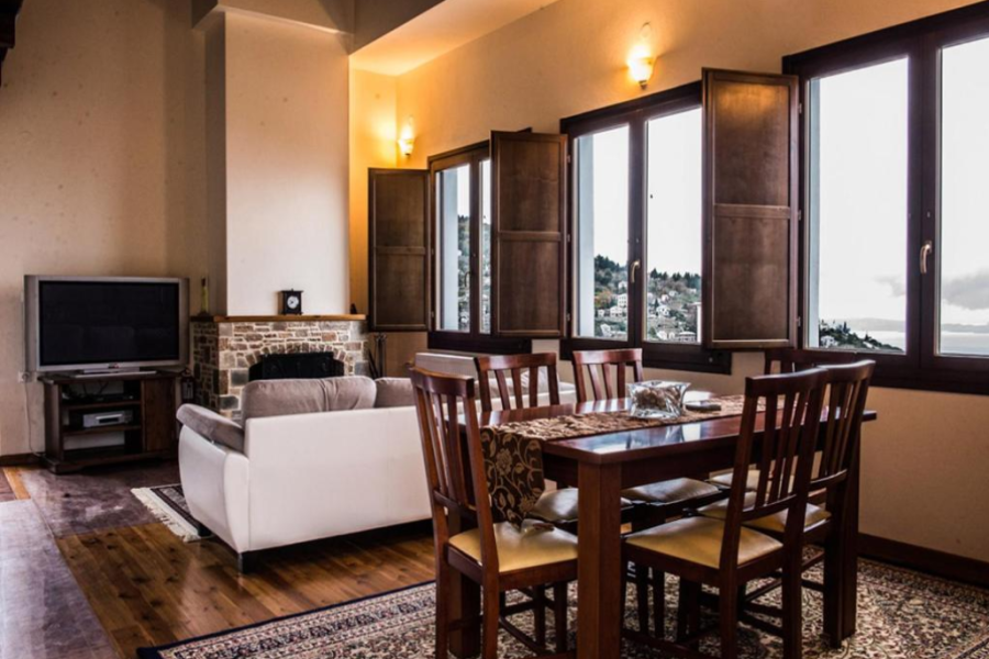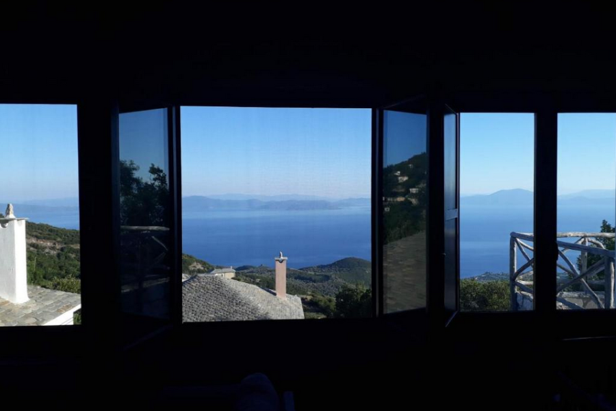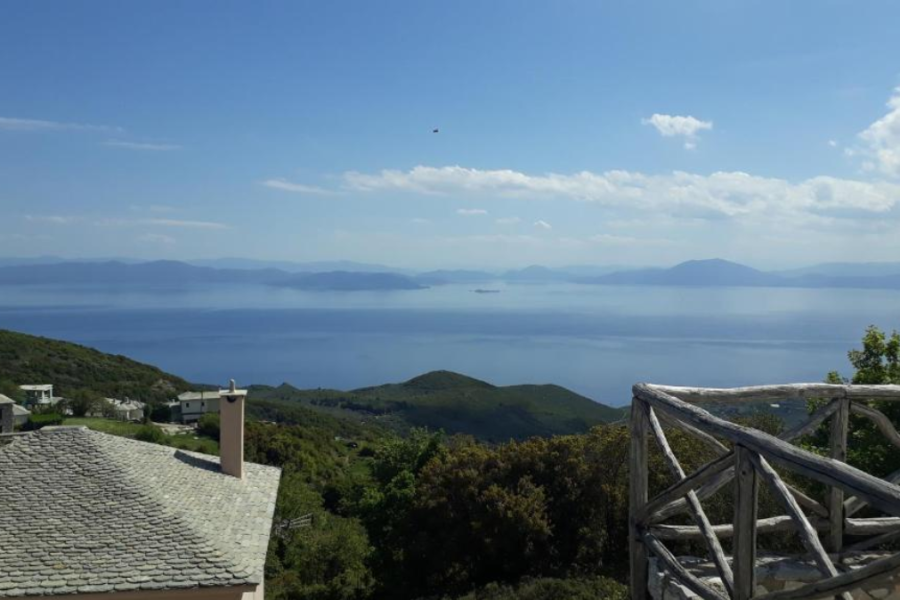 Maisonette of three levels 138 sqm on a plot of 400 sqm for sale in Agios Georgios Nilias, Pelion. From all points and the 3 levels of the house there is panoramic view of the sea and the mountain. Private plot with a garden of 400 sqm with very nice trees (fir, mistletoe, cherry, apple tree) and aromatic Mediterranean plants (rosemary, oregano, thyme, mint, basil, etc.). The house has radiators, boiler and fireplace. it also has 2 large balconies with panoramic sea view and a storage room. The ground floor has three bedrooms and a spacious bathroom with washing machine and heated towel dryer. In the main bedroom there is a double bed for 2 persons and a very large wardrobe with mirror. The middle bedroom has 2 single beds that can be joined to make a double bed and a large mirrored wardrobe. The small bedroom has a single bed and a large high wardrobe. The ground floor has three large Pelion windows with “aerial view” of the sea.Also on the ground floor is the large fireplace, the dining room, the sofa that sleeps and person, a huge TV, a sophisticated kitchen and a toilet. On the 1st floor there is a large living room with fireplace, full kitchen, and toilet. Finally the roof has a large table with board games, a sofa, a bamboo armchair and a bamboo table