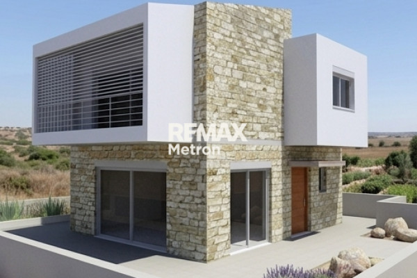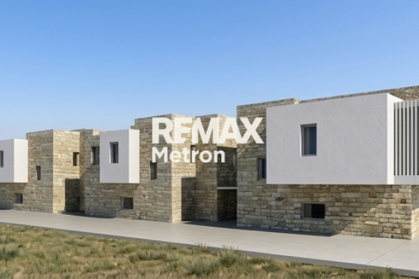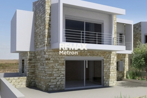 The architectural design combines modern aesthetics with stone elements, fully in harmony with the natural environment of Halkidiki.