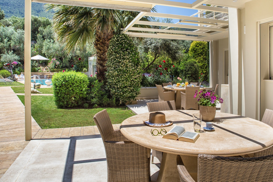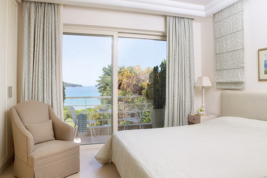 The luxurious homes offer a total of 8 bedrooms and 9 bathrooms. Each residence features a living room with a fireplace, a fully equipped kitchen, and spacious verandas with unobstructed views of the sea and the mountains of Evia.