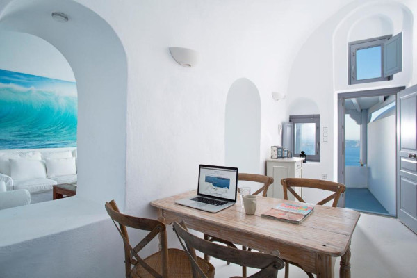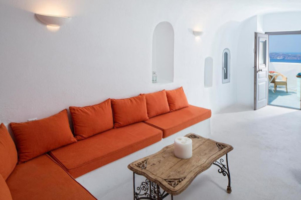 The terrace offers a panoramic view of Santorini's iconic volcano and the endless blue of the Aegean, creating an enchanting backdrop throughout the day.