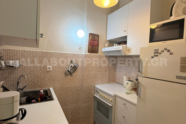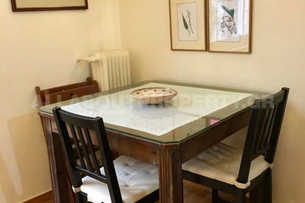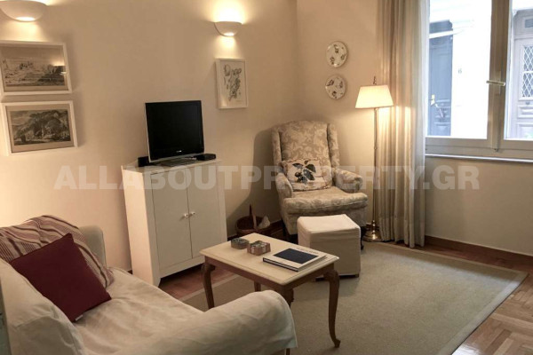 In a quiet pedestrian street in the center of Athens in Exarchia, in a neighborhood with a special character and a lively cultural atmosphere, a furnished apartment of 45 sq.m. is available for rent. in a well-preserved 1960s building.