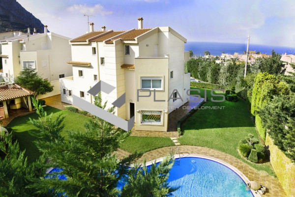 Kalyvia-Lagonisi, Galazia Akti, Detached house For Sale, 550 sq.m., In Plot 1272 sq.m., Floor: Ground floor, 4 Level(s), 5 Bedrooms (4 Master), 1 Kitchen(s), 6 Bathroom(s), Heating: Autonomous - Petrol, View: Sea view, Building Year: 2001, Energy Certificate: D, 2 parking(s), Features: Security door, Security alarm, Fireplace, Attic, Playroom, Internal Staircase, Balconies, BBQ, Airy, AirConditioning, Boiler, Automatic Watering, Swimming pool, Back yard (Garden), Distance from: Seaside (m): 500, Price: 1.100.000€ - The location of the property on the map is indicative.