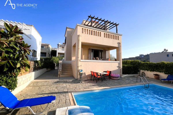 On the ground floor there is a large living room and an open space kitchen. The kitchen is equipped with a dishwasher, an oven, a hob and a fridge. On the ground floor there is one bedroom and a large bathroom with space for a washing machine. On the upper level – two bedrooms with large closets and another bathroom. Next to the bathroom there is a staircase leading to the roof terrace. Under the stairs there is a spacious storage space. The courtyard of the villa overlooks the spectacular views and features a seating area and a paved patio. The villa haw air conditioning and underfloor heating in the living areas.
